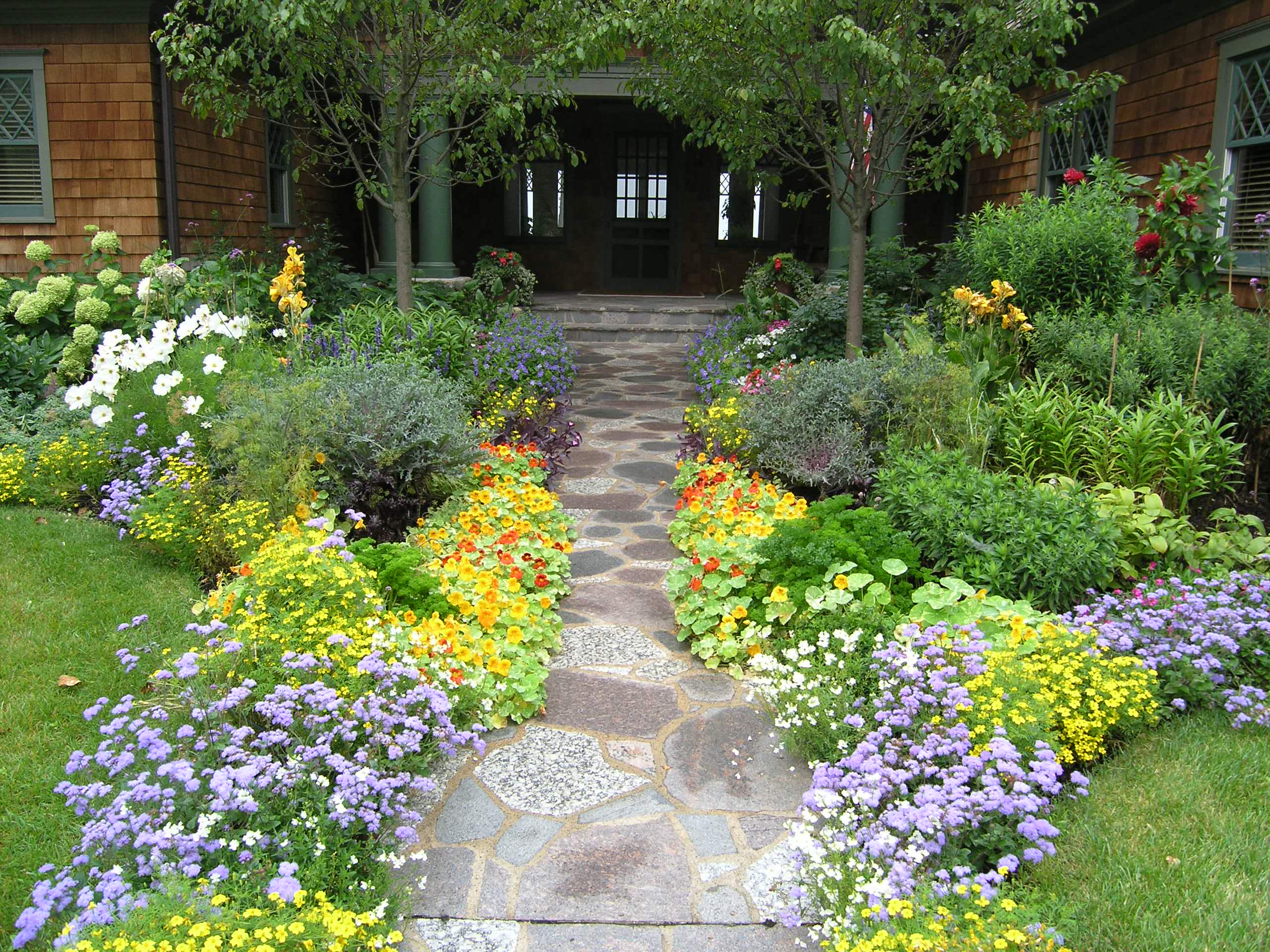 This abundant entry garden feels thoroughly in balance as the composition draws on elements that are both symmetrical and asymmetrical. The flagstone path creates a strong, straight axis to the home's front door. There are many plants that mirror each other on either side of it, including two shade trees that flank the path. But thanks to the freely flowing annuals and perennials that have minds of their own, nothing is too perfect or too matchy-matchy. And that's why we're charmed by this scene.