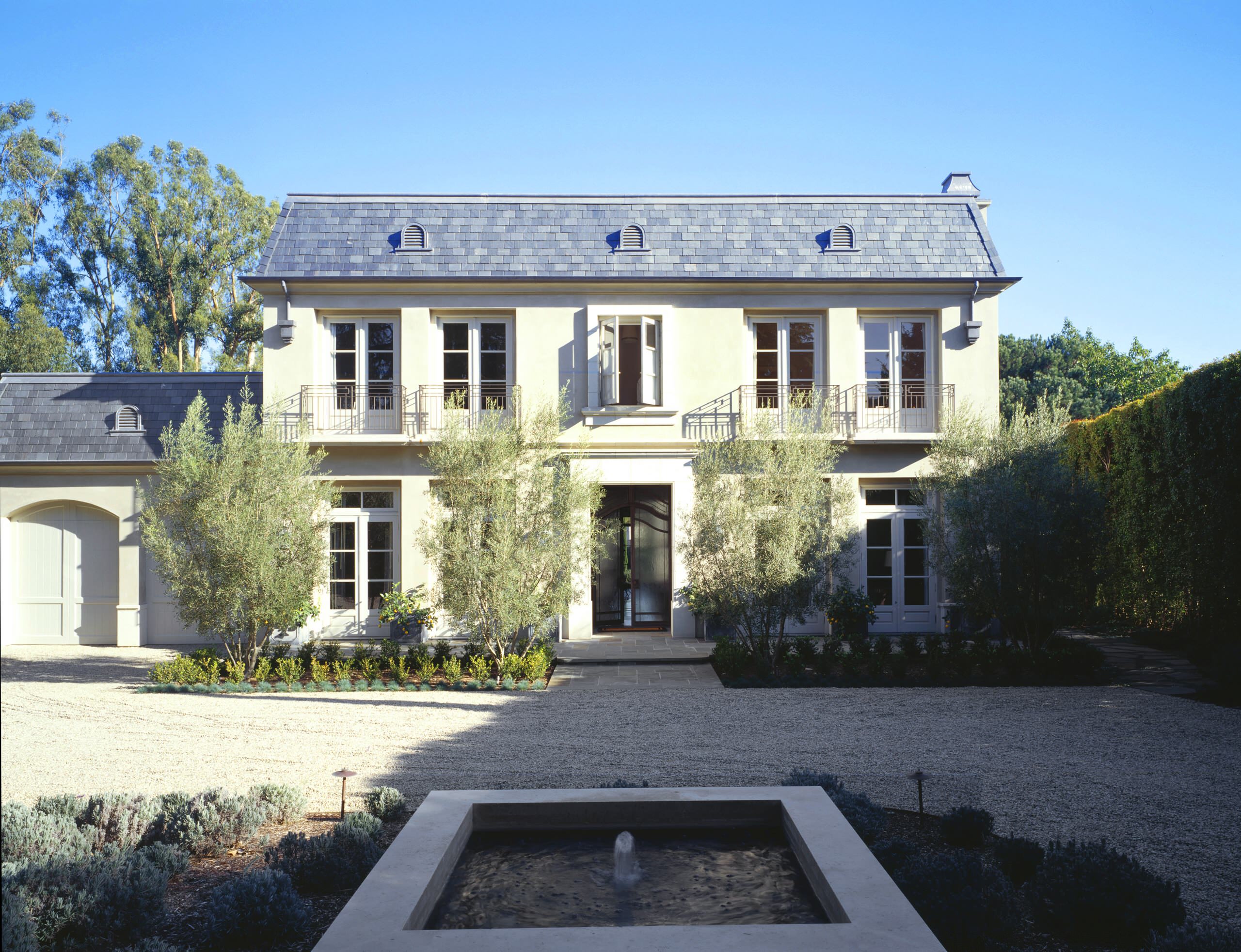 Classic but not dated, this French country–inspired residence relies on symmetrical balance. From the placement of the bubbling fountain in the auto court — aligned perfectly with the front door — to the four olive trees that are placed two per side, this is a picture-perfect example of good balance. The garage is attached at the left, of course, but it is visually balanced by the dense hedging to the right.