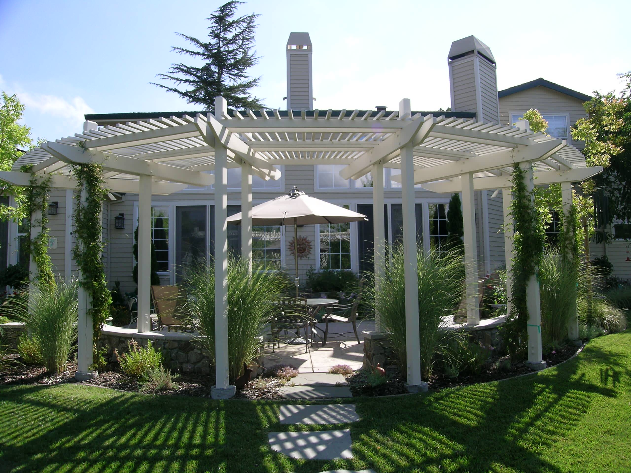 The slats of this circular arbor span outward like the framework of an open fan and create a dynamic architectural point of view. Perfectly situated in alignment with the home in the distance, the structure uses radial lines to add interest to a formal landscape.