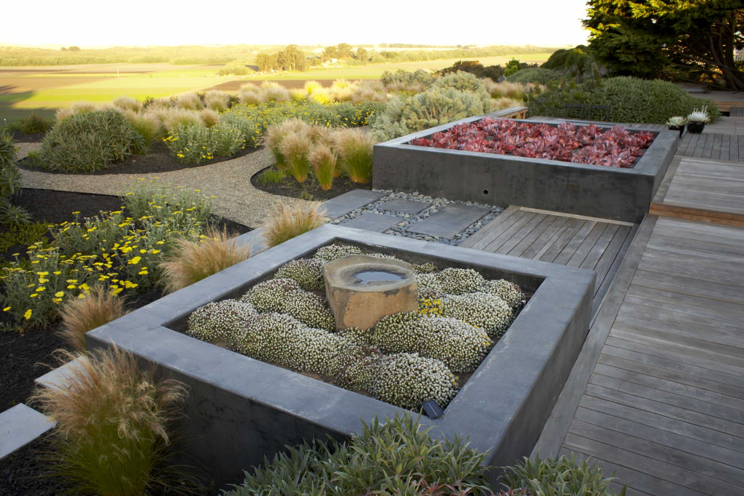 The pair of raised planters on either side of the wood corridor is a hybrid combining both symmetrical and asymmetrical aspects. They are certainly made from the same stone and feature the same square proportions. But there are different textures, shapes and colors of vegetation in each planter, infusing a touch of asymmetrical balance into the design.