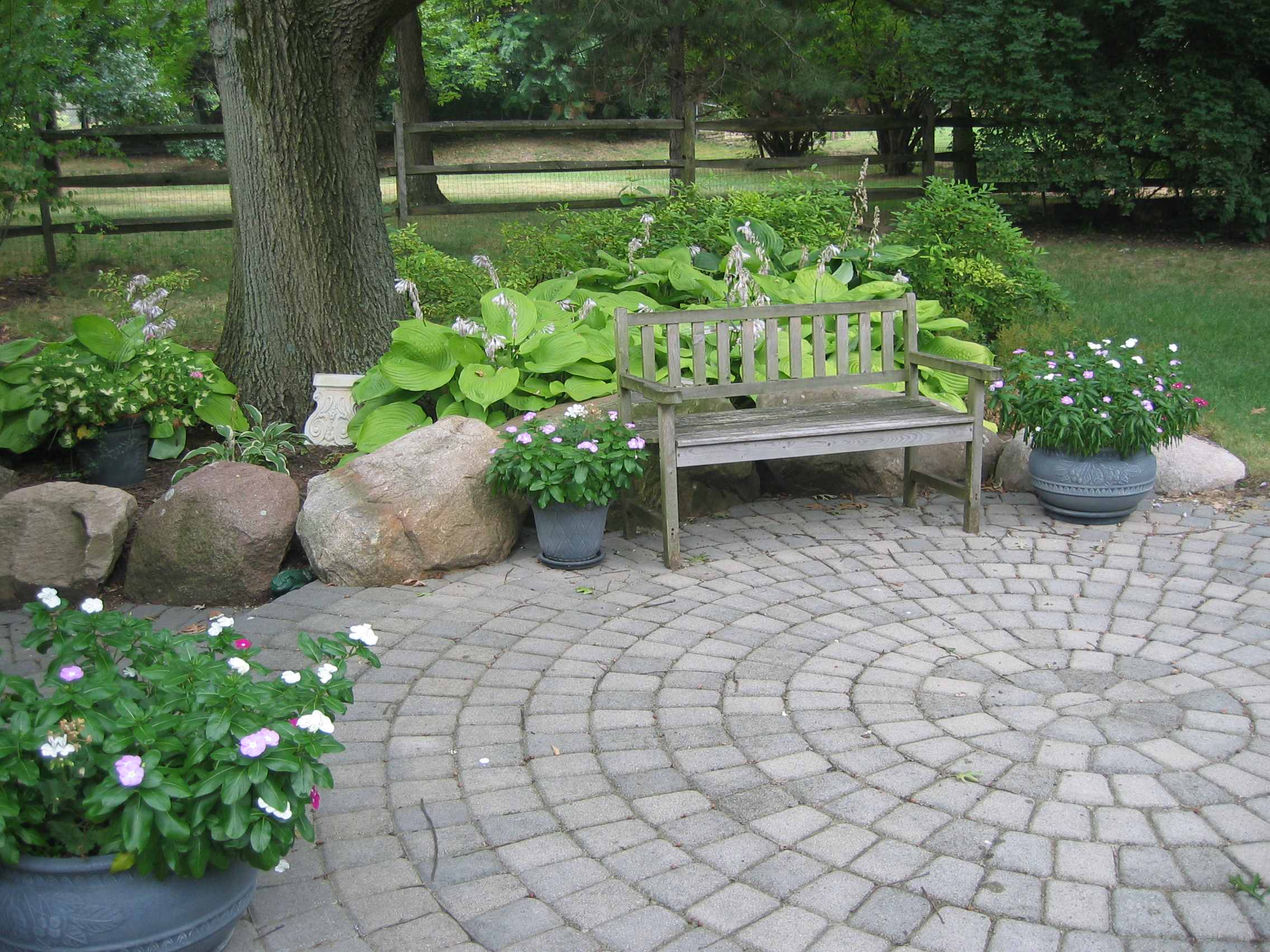 Radial balance is seen here in a perfectly round cobblestone patio in a quiet shade garden. Think about how ordinary this space would appear with a traditional flagstone patio or a concrete slab. Using the radial design both energizes and enlivens the garden.