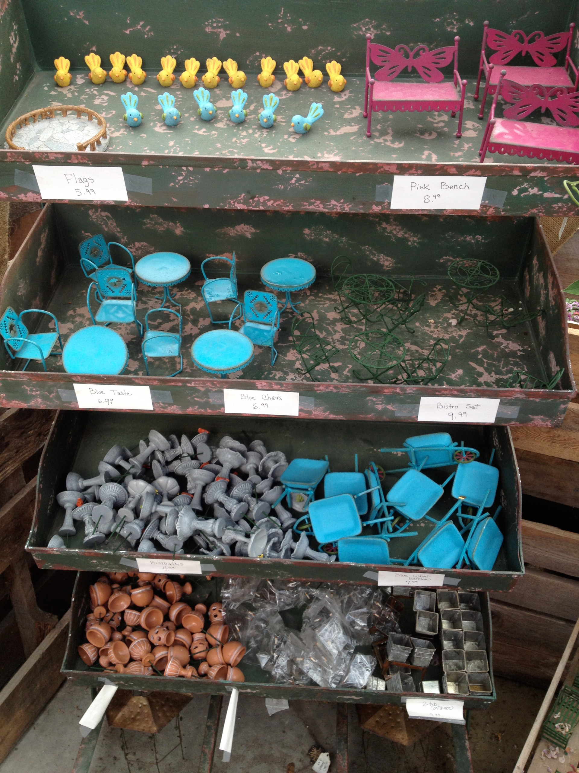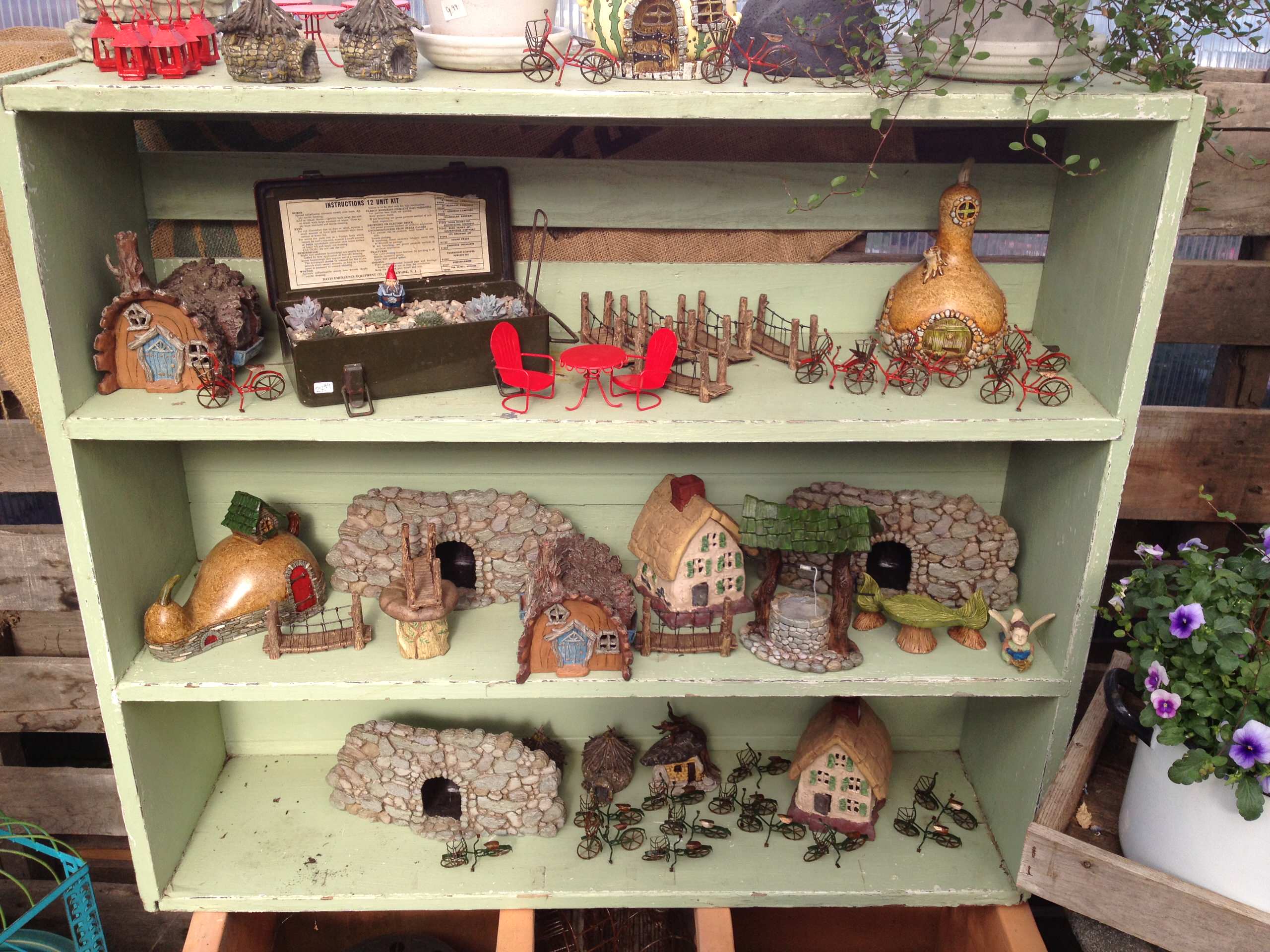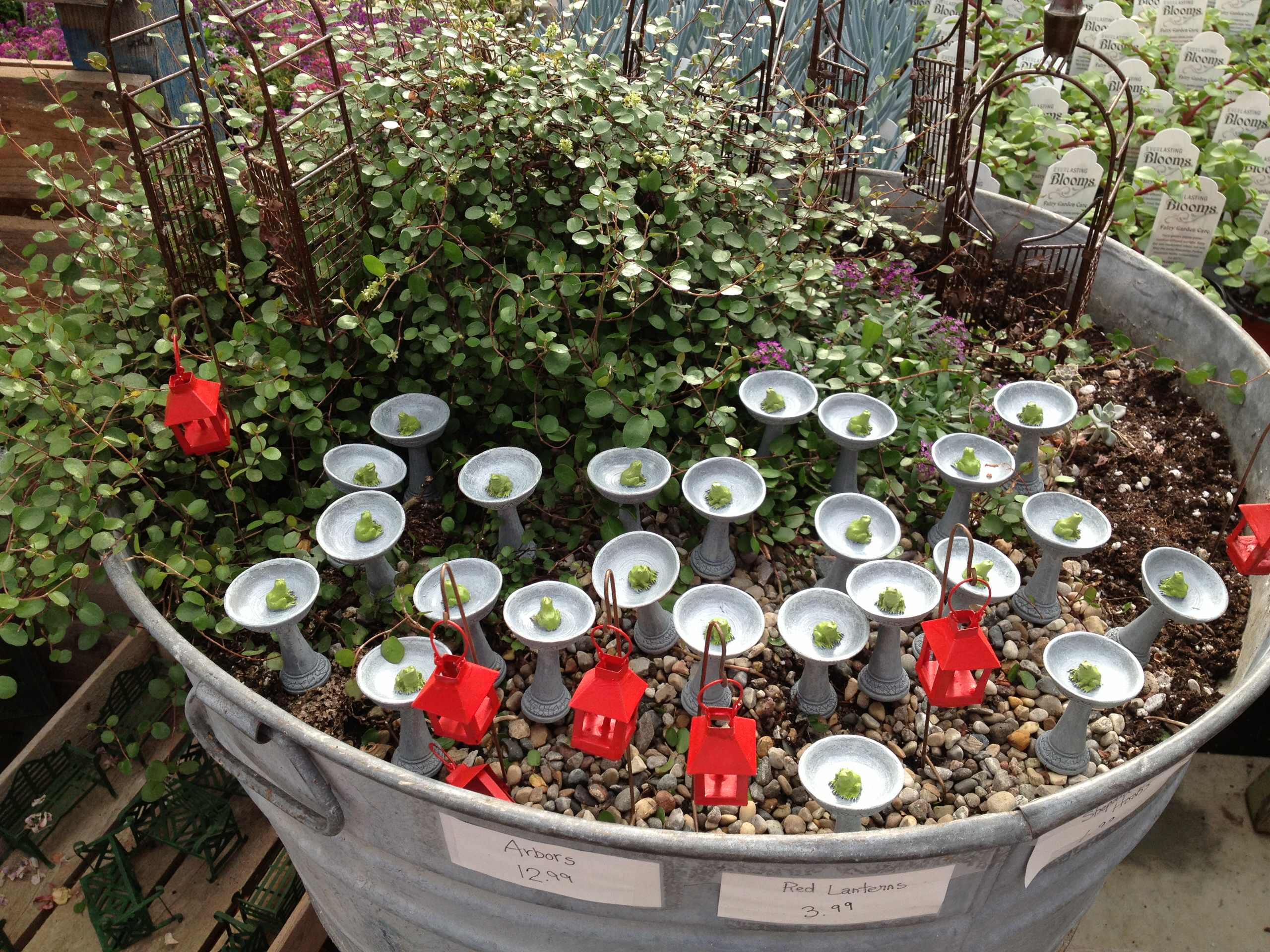Finally, you need to choose your accessories. This can be the hardest part. Do you want a bench, a chair, a wheelbarrow, a hanging pot, a frog perched in a birdbath? A ceramic bunny, rabbit or lamb?