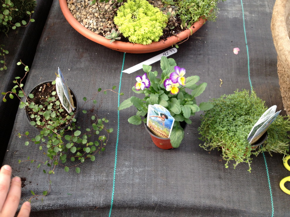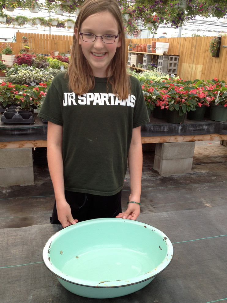 To start you need to choose a container. My mom knew we were taking the class and nabbed this jadeite-green enamel pan at a garage sale for Eden. It was widely admired. Others had wagons, small crates, trays, large terra-cotta saucers and boxes; one lady even used a jewelry box.