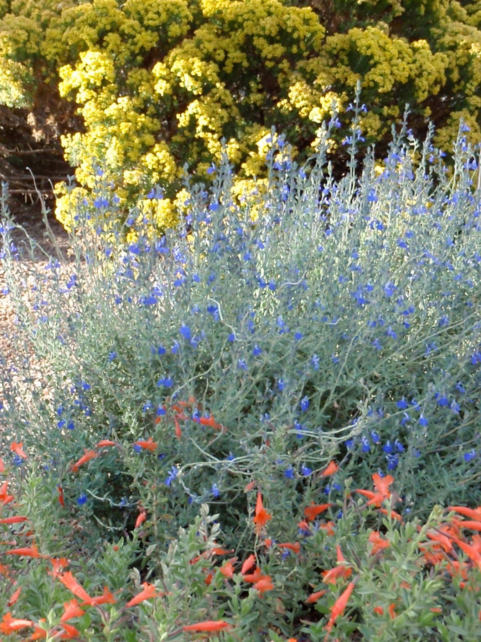 Germander sage grows in front of turpentine bush (Ericameria laricifolia) and behind California fuchsia (Epilobium canum) in a New Mexico garden.