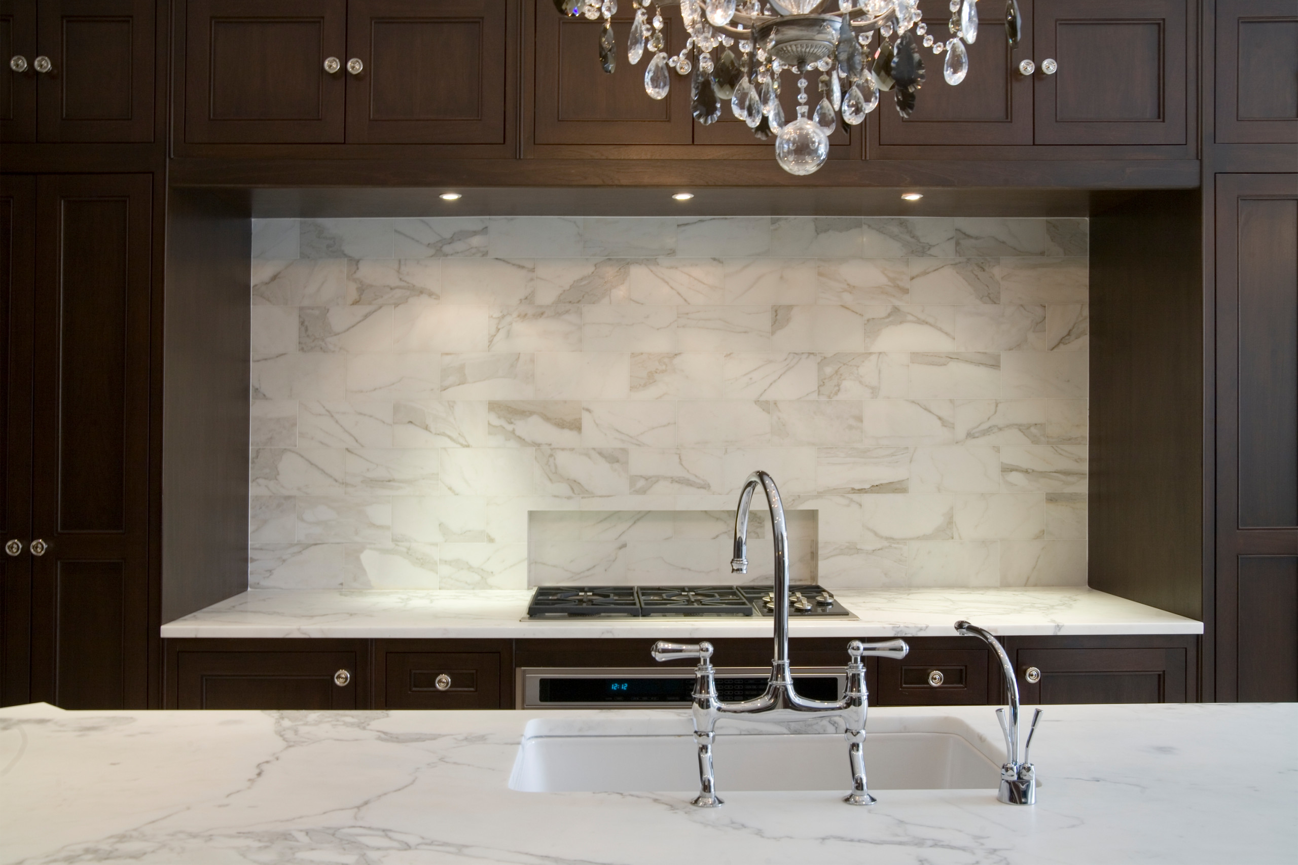 Going back to the traditional example, the cabinets are a rich wood tone, but lots of white is incorporated through the other finishes, such as the counters and backsplash. The cabinets feel weighty and mature, but the overall space still has some visual breaks for good balance.