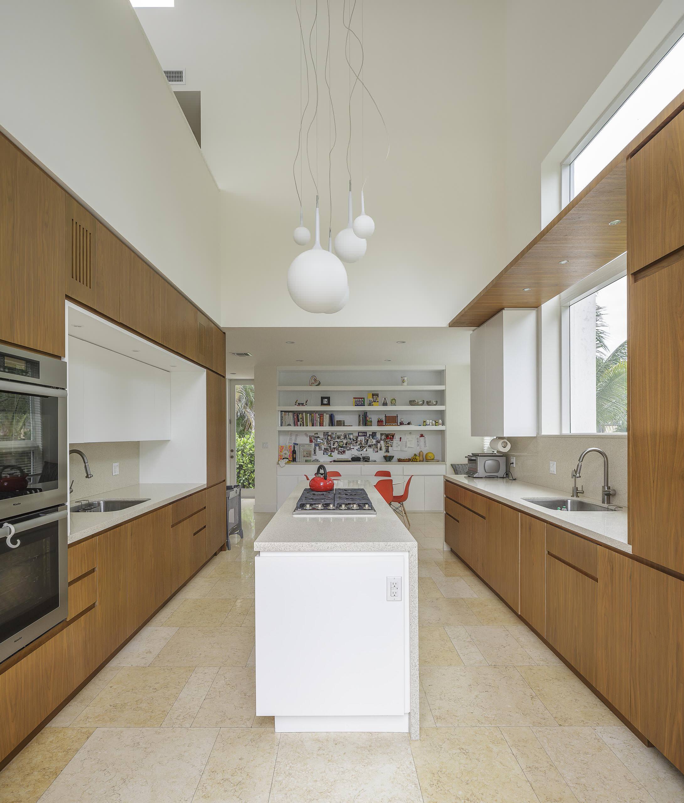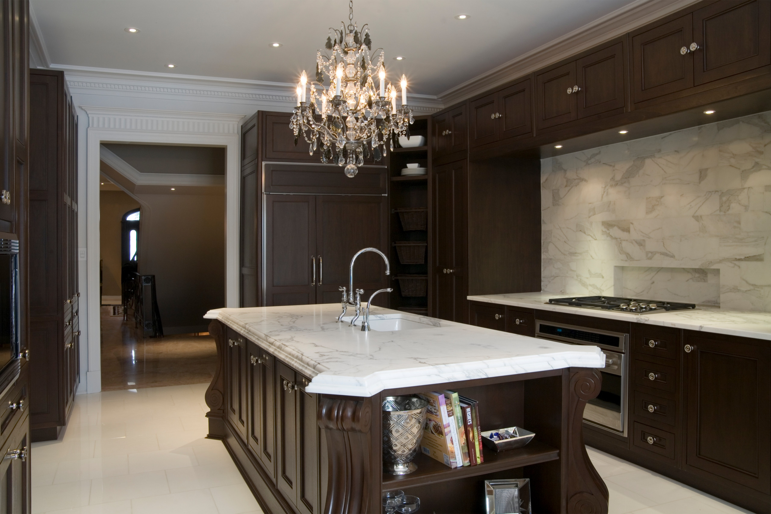 In the same kitchen as the previous photo, this angle reveals that the espresso cabinets are all one depth.