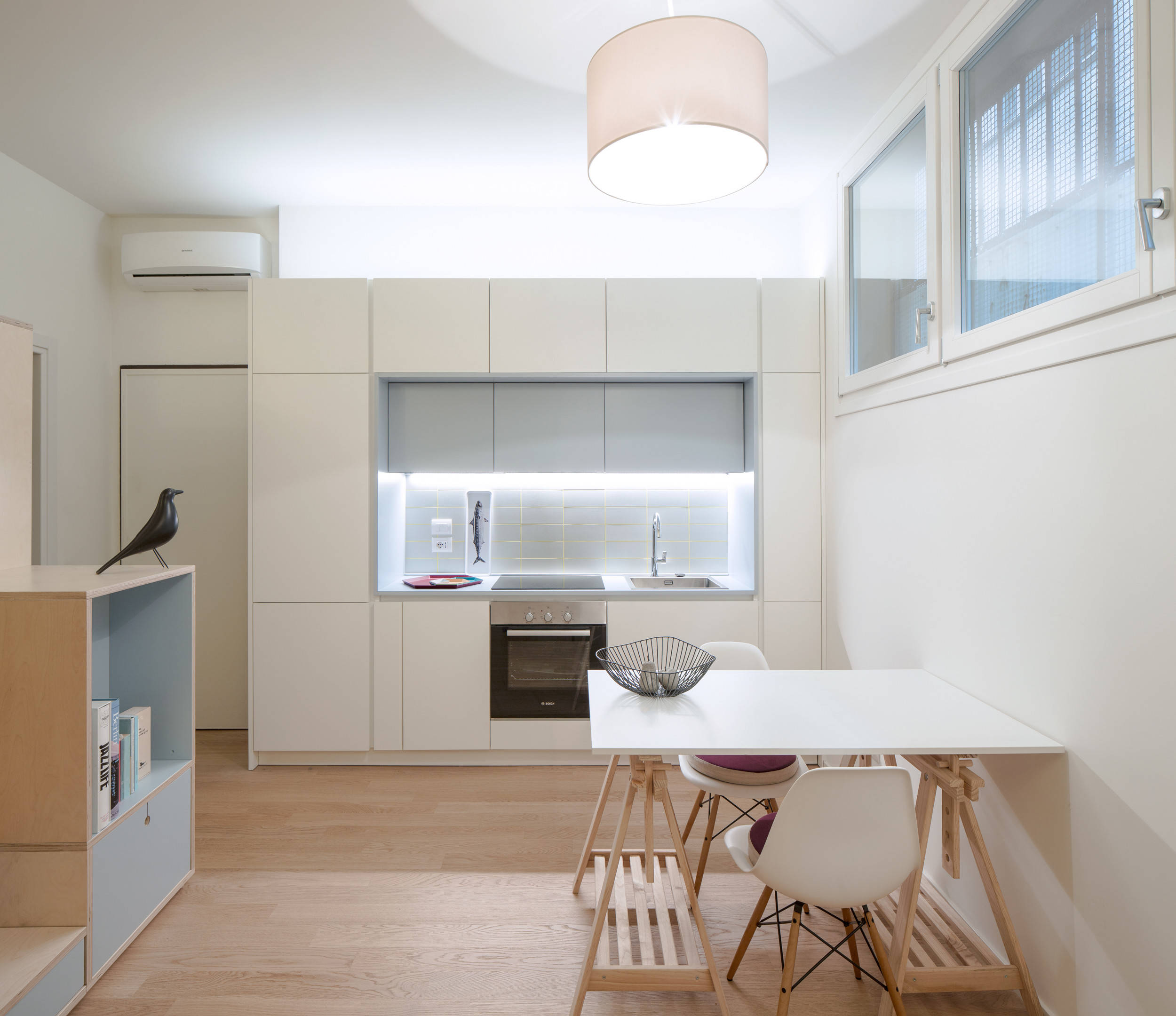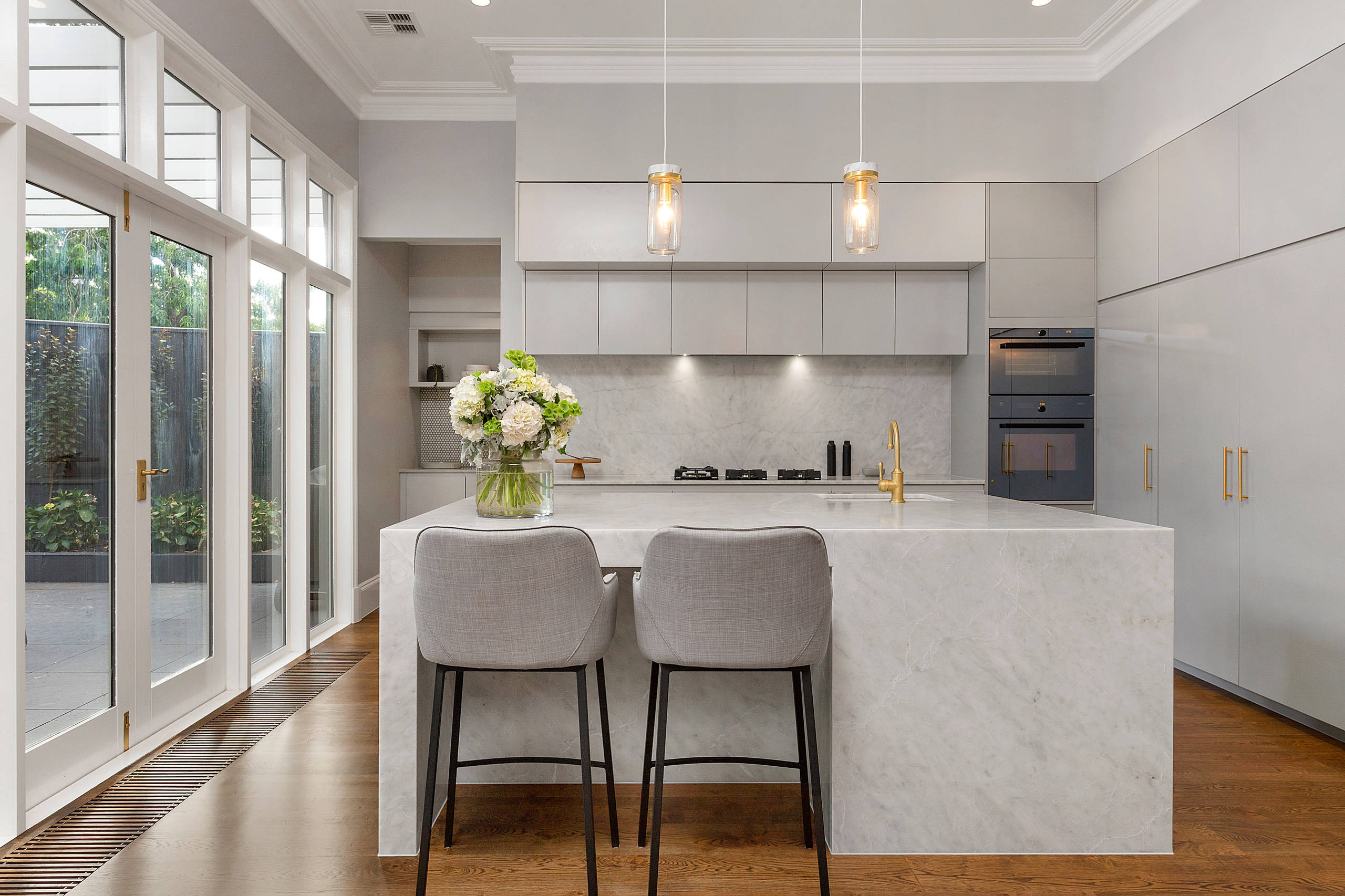 In this example, the deep upper cabinets are matched to the white on the wall so they almost appear as part of the bulkhead above, with the other cabinets all dressed in a soft gray. The effect is subtle, but it appears almost as if the deep upper cabinets don’t even exist, with just an elegant and breezy kitchen meeting the eye.