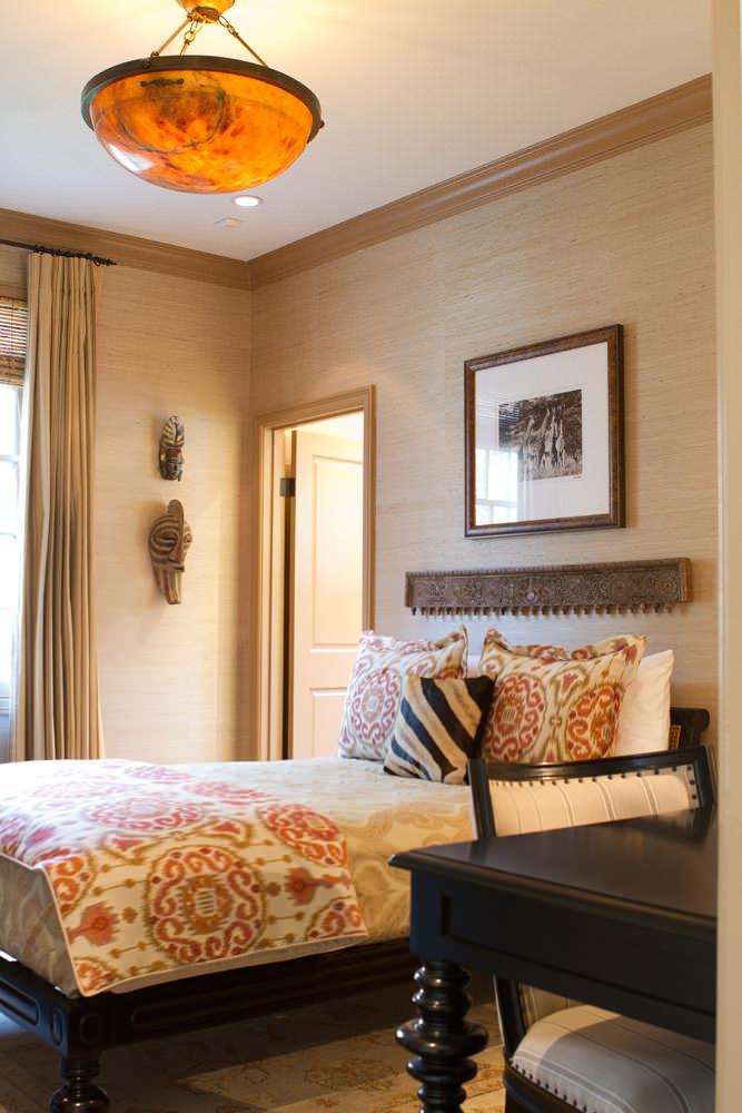 This room is giving off major "I'm well-traveled" vibes, with the plantation bed, the ornate caved piece over the headboard, the carved masks on the walls and the exotic bedding textiles.
