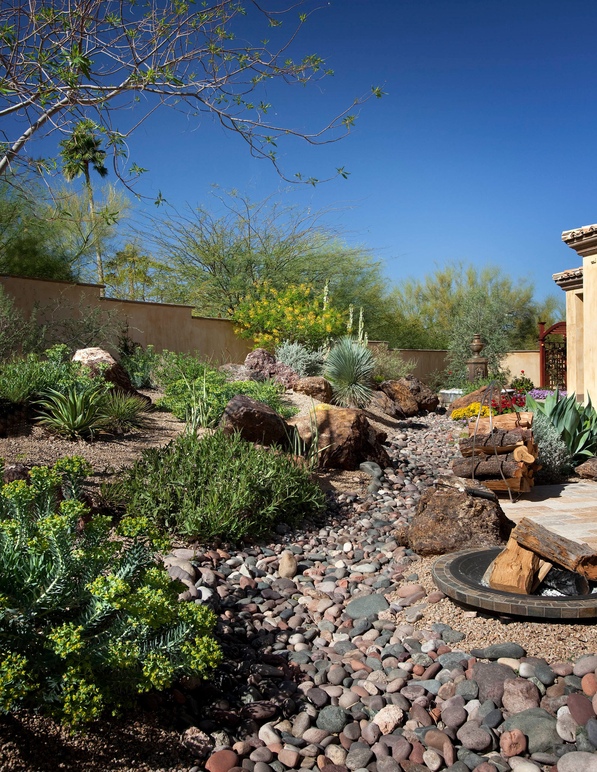 Dry creek beds. Even the illusion of water can have a calm, soothing effect in a landscape design. The designer of this dry creek bed used the natural desert washes of Arizona’s mountains as inspiration. Dry creek beds can also be efficient ways to manage stormwater runoff