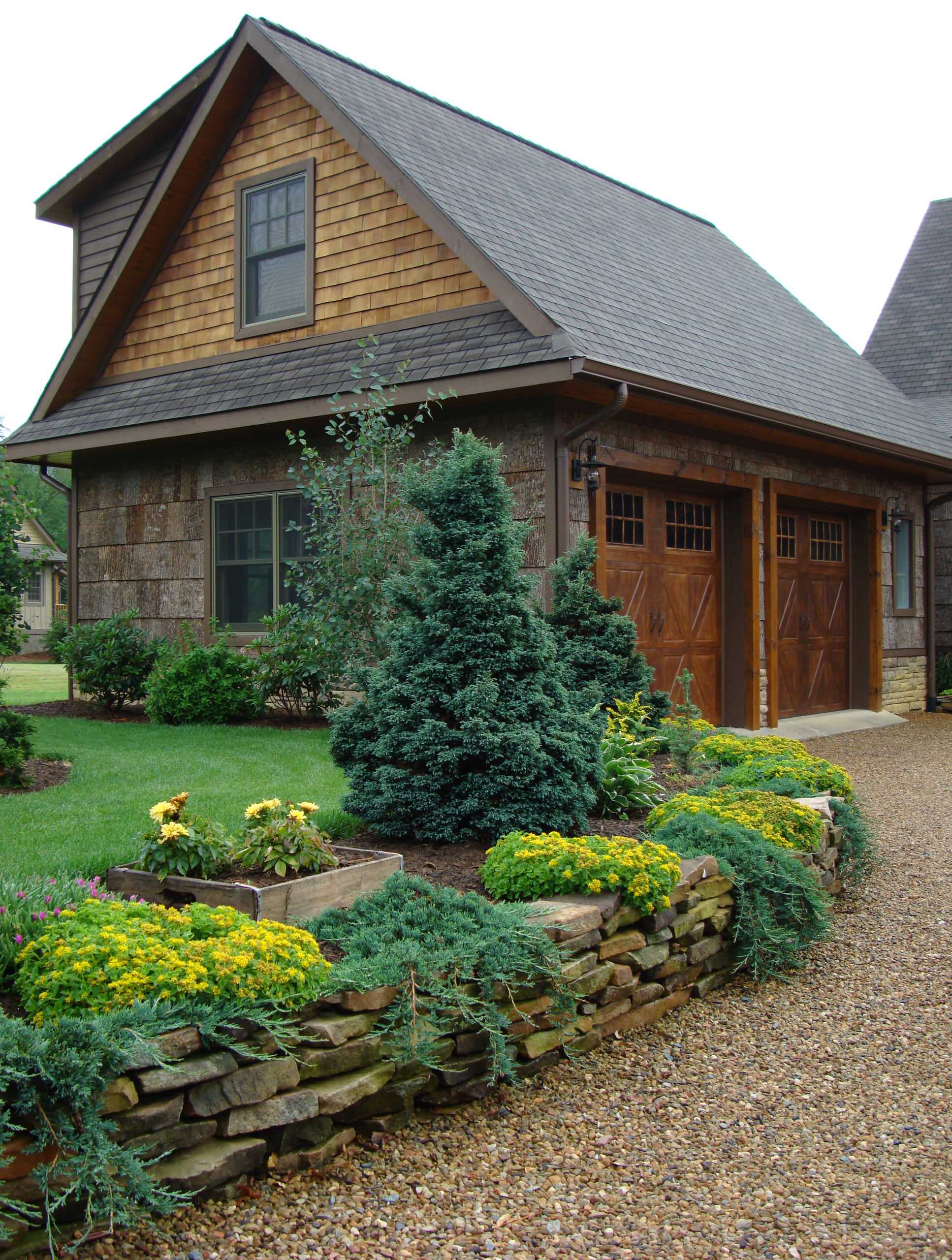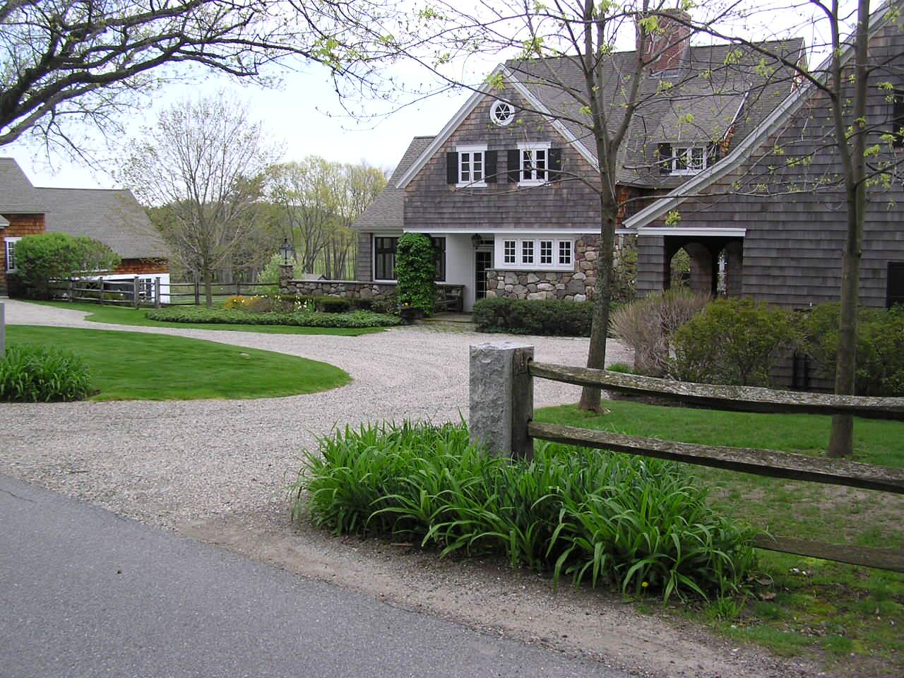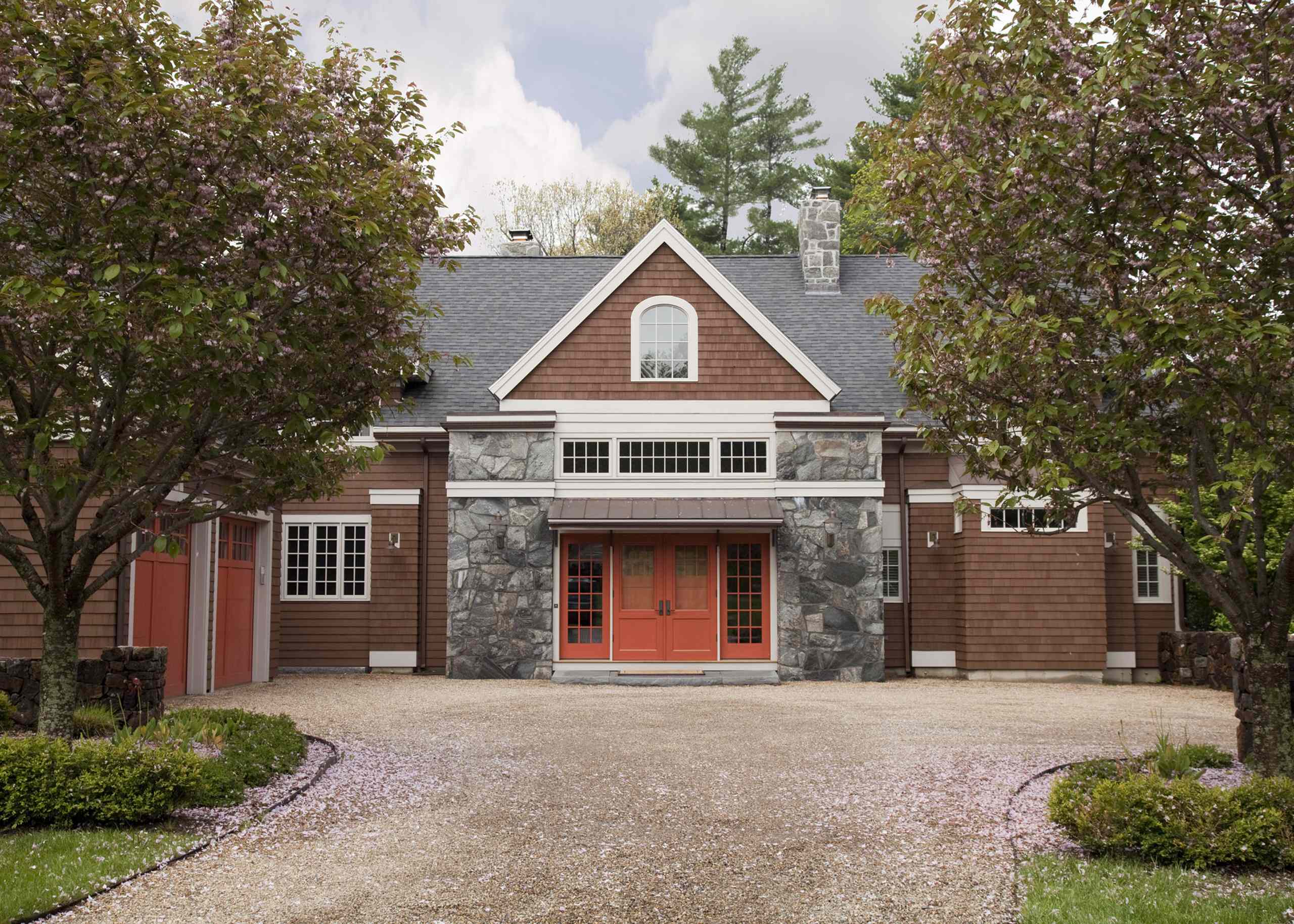 The long gravel path leading up to this beautiful house enhances the rustic charm of the exterior. Like a good rug, it ties everything together, and the landscape transitions seamlessly to the house.