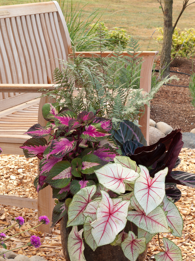 This painted fern is also useful in seasonal pot displays. Here it is beautifully paired with beefsteak plant (Perilla frutescens ‘Magilla’, zone 11) and caladium (Caladium bicolor, zones 9 to 11). The secret is to use this fern to subtly reinforce the foliage color of its neighbors while using its foliage to best advantage to create contrast.
