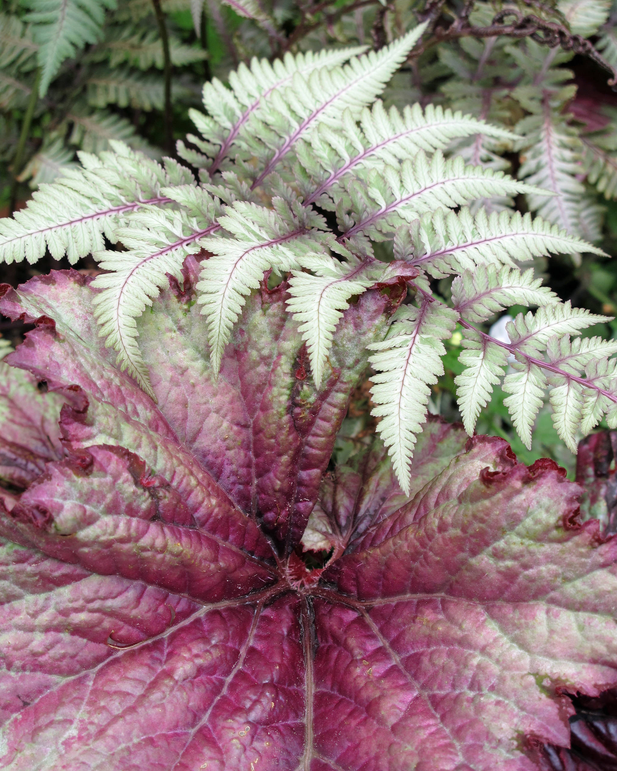 Japanese painted fern is at its best when paired with pink or burgundy accents, such as are highlighted in this rex begonia (Begonia rex-cultorum, zones 10 to 11). Other worthy companion plants include strawberry begonia (Saxifraga stolonifera, zones 6 to 9) and Chinese fringe bush (Loropetalum chinense, zones 7 to 9).
