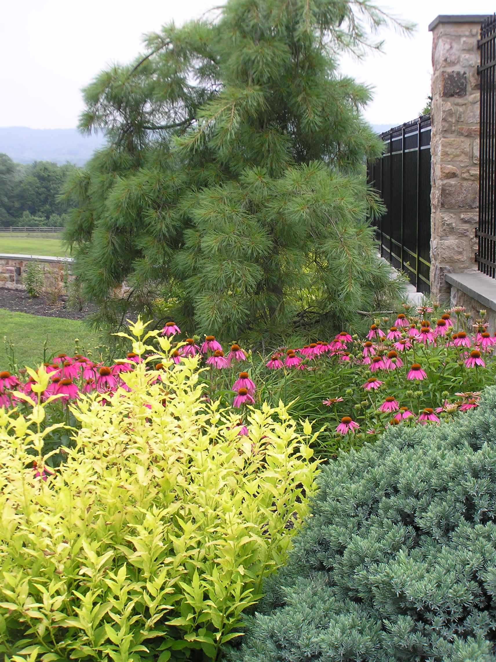Because of its compact size, ‘Blue Star’ juniper, shown here in the foreground, is a welcome addition to container gardens, adding essential color and texture.