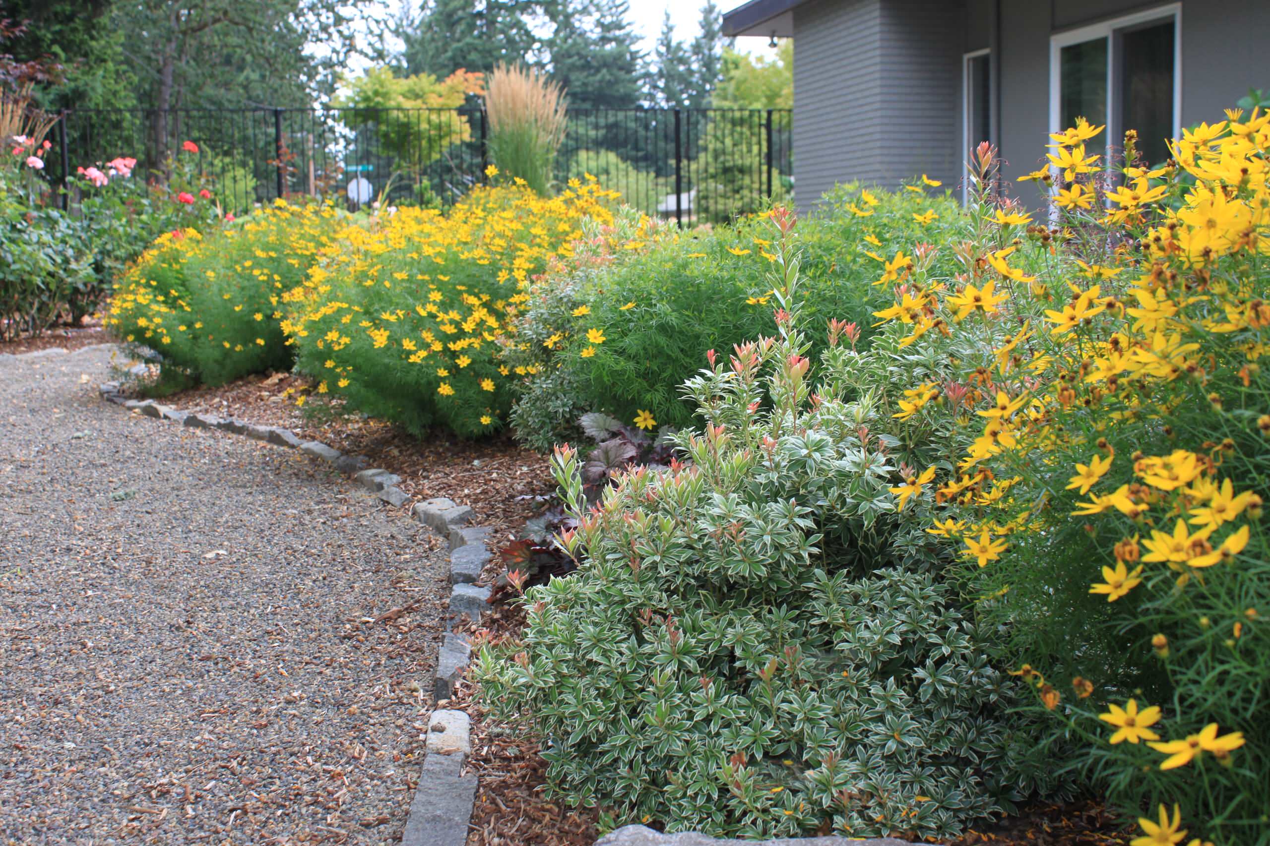 Here the designer has combined it with the summer blooming Zagreb tickseed (Coreopsis verticicllata ‘Zagreb’). When this perennial becomes dormant in winter, the andromeda will continue to add color to the border.