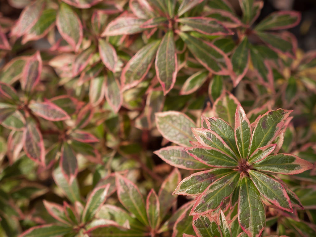 Distinguishing traits. This offers true four-season interest. While the pretty green and white variegated leaves are evergreen, the pink new growth in spring is especially attractive, with racemes of fragrant, bell-like white flowers. As the temperature dips in fall, the entire shrub takes on a delightful rosy blush.