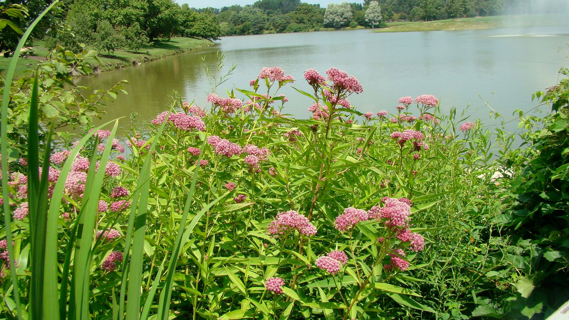 Swamp milkweed (Asclepias incarnata, zones 3 to 6). Here's a closeup of swamp milkweed in bloom, with a bumblebee coming in for nectar. The flowers can be pollinated only if an insect slips a leg deep down into a specific spot of the bloom, which isn't often. (You can use that bit of knowledge on your next date night when the conversation lags.)