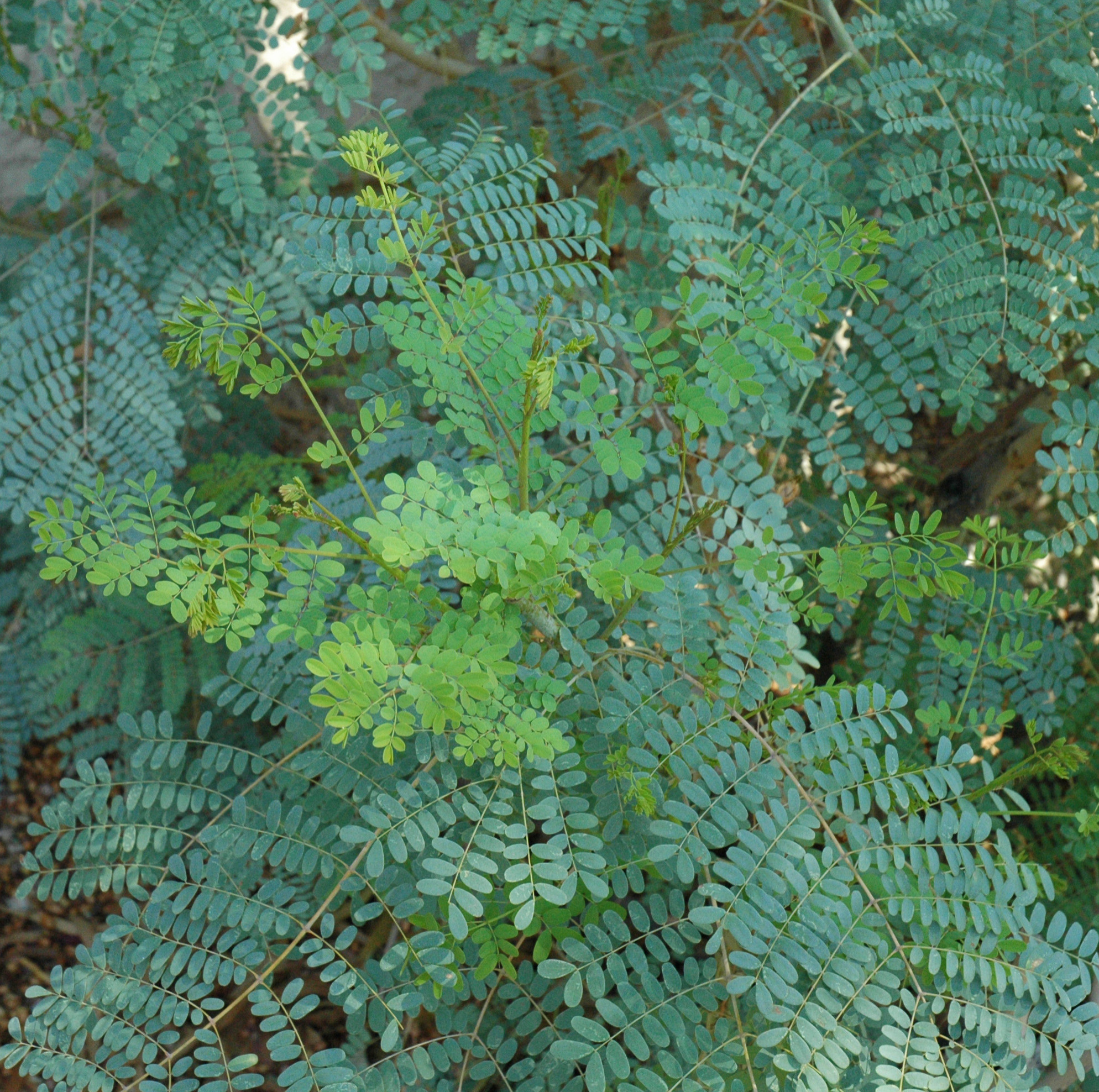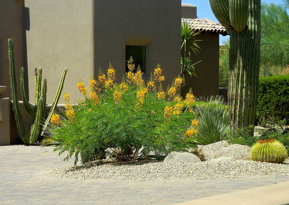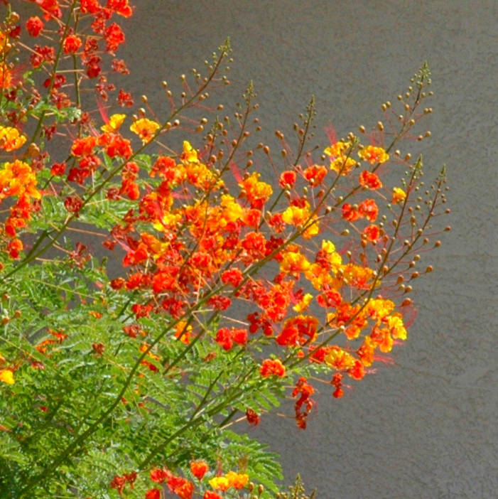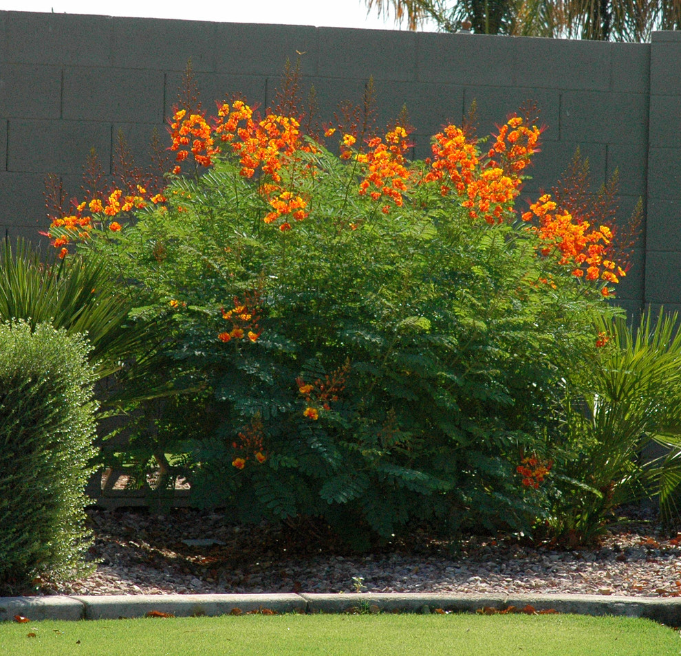 The foliage consists of tiny leaflets that lend a tropical look to a desert landscape. Dormant in winter, red bird-of-paradise will die back to the ground, but it will grow back quickly in spring.