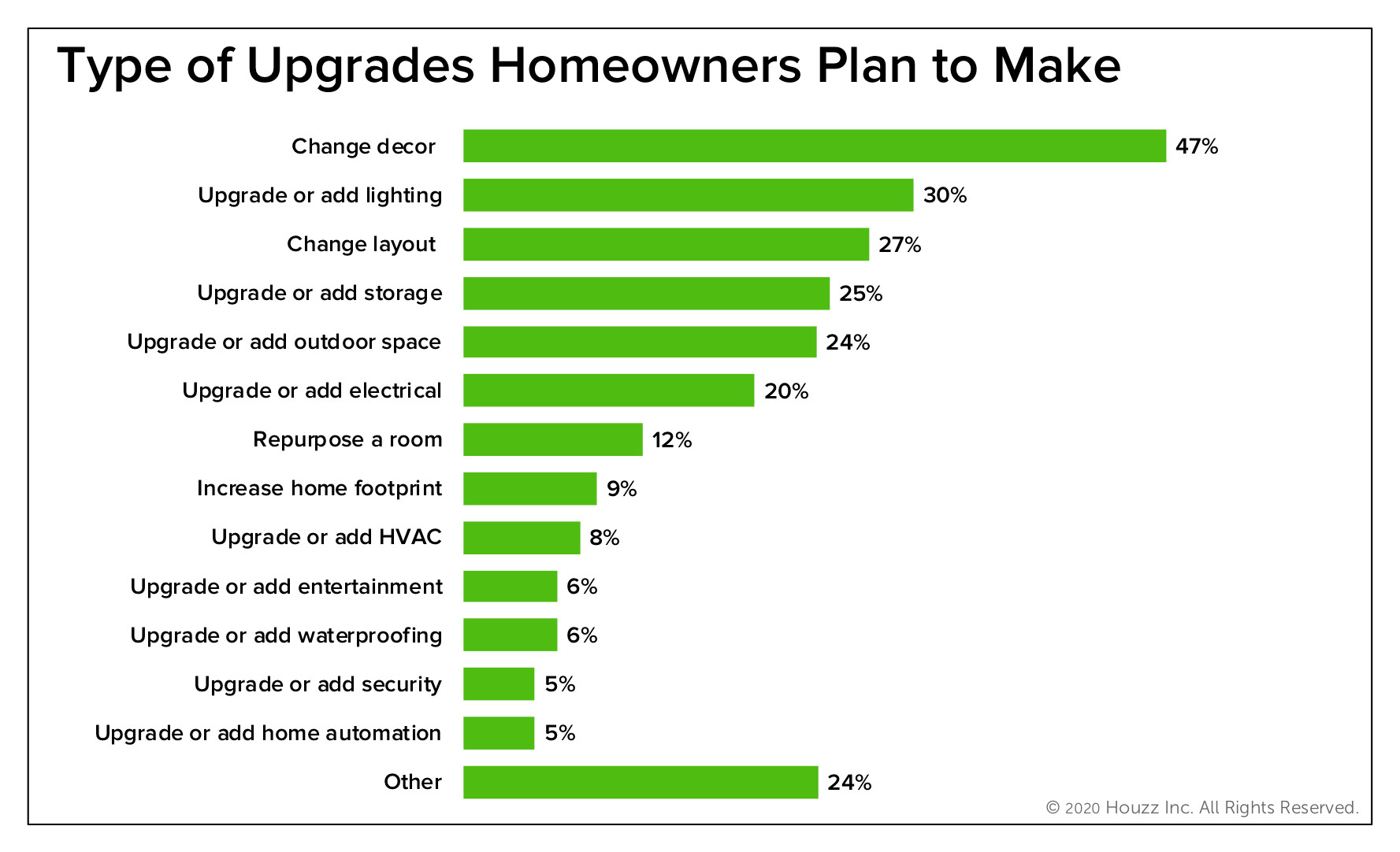 Among the changes desired by homeowners planning to improve their homes are new decor (47%), better lighting (30%) and an improved layout (27%).