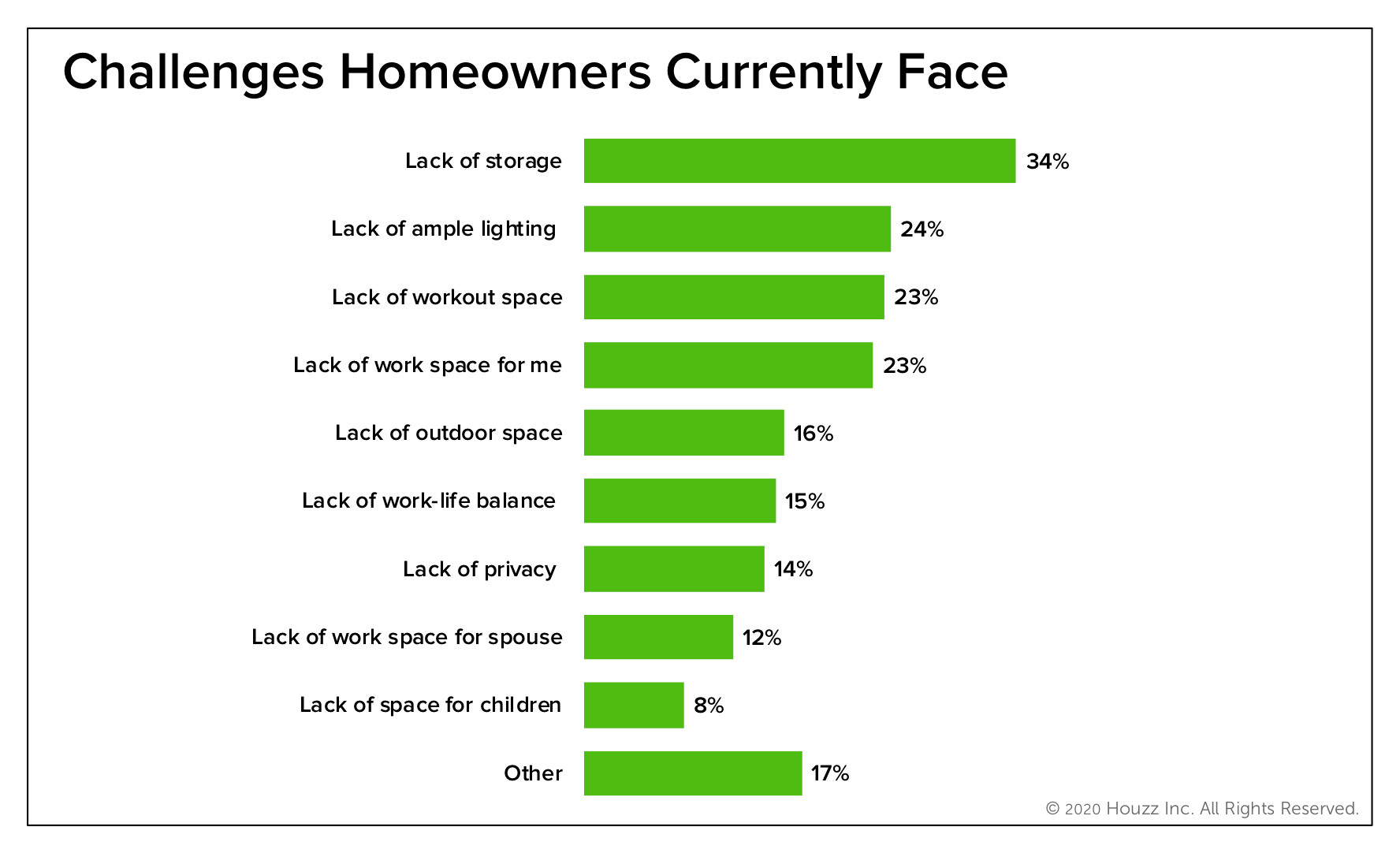 As they look at their homes with an eye toward improvement, half of homeowners reported facing challenges in their current homes, according to the survey. Among this group, the No. 1 challenge cited was a lack of storage (34%), followed by a lack of ample lighting (24%). Not having a workout space (23%) or a workspace (23%) were other common concerns.