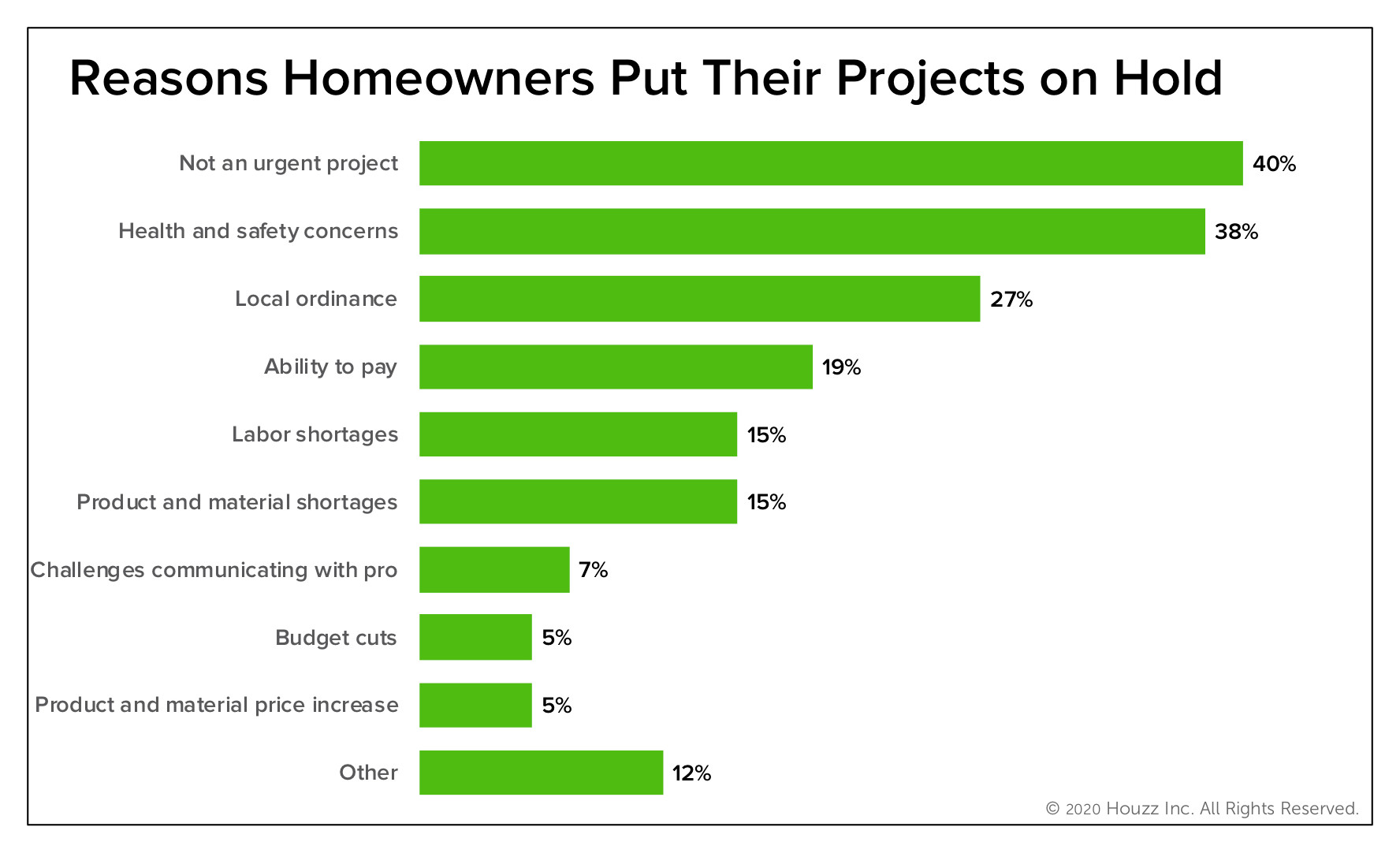 Forty-seven percent of homeowners who were in the midst of a project when the pandemic hit put their projects on hold. Of those, 2 in 5 felt the project wasn’t urgent and could wait, according to the survey. Nearly as many (38%) had health and safety concerns that led them to pause their projects. And 27% put their projects on hold due to local ordinances.