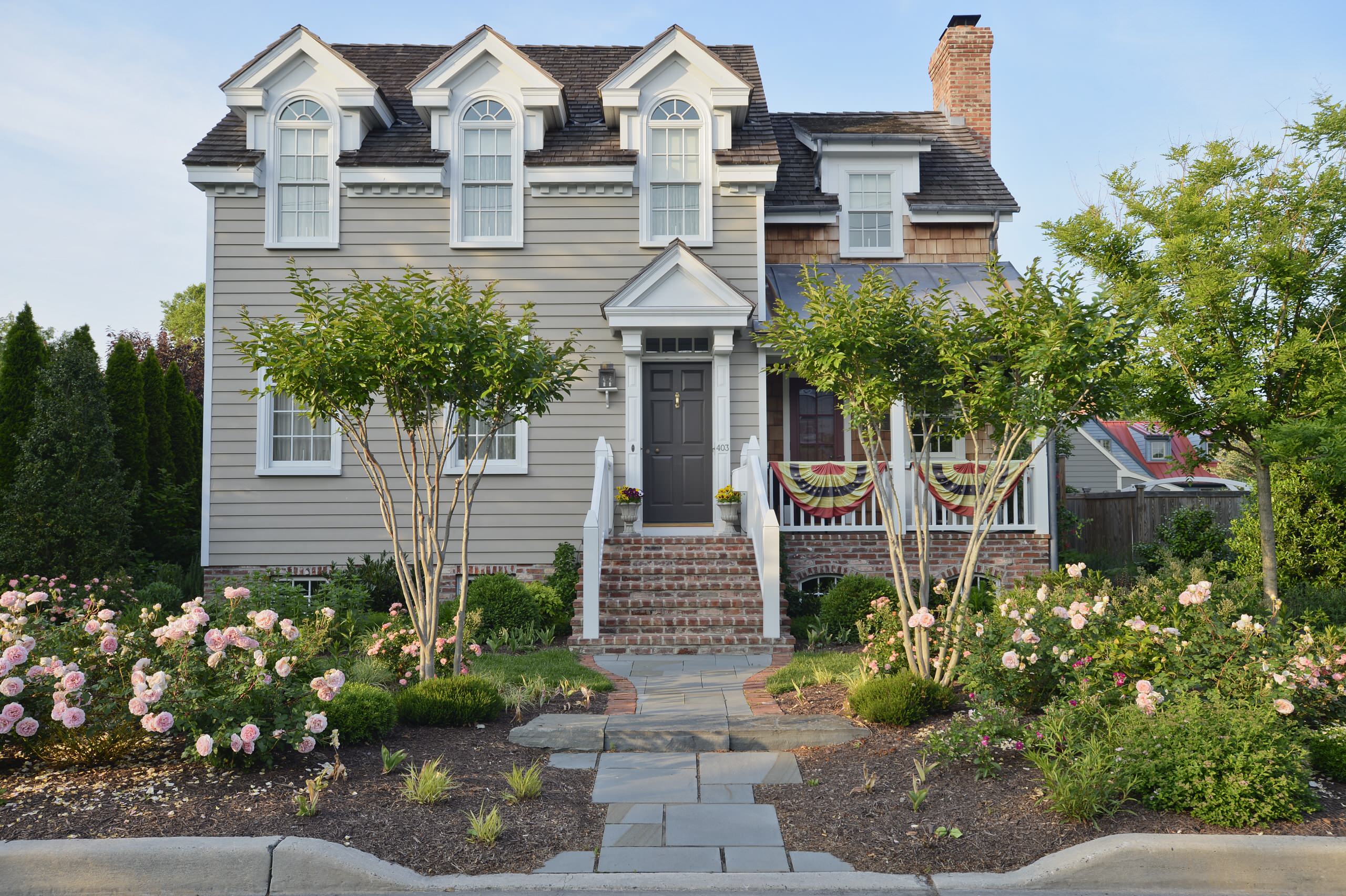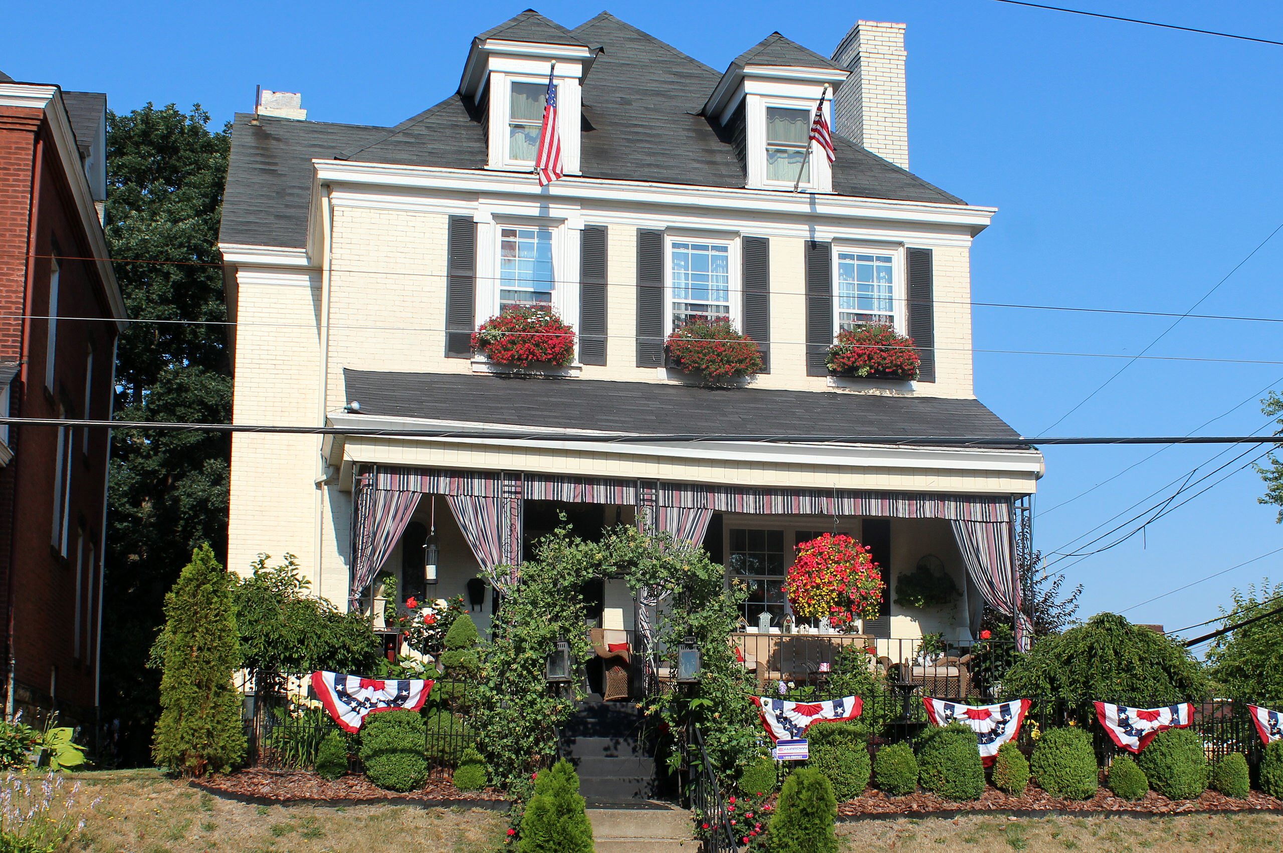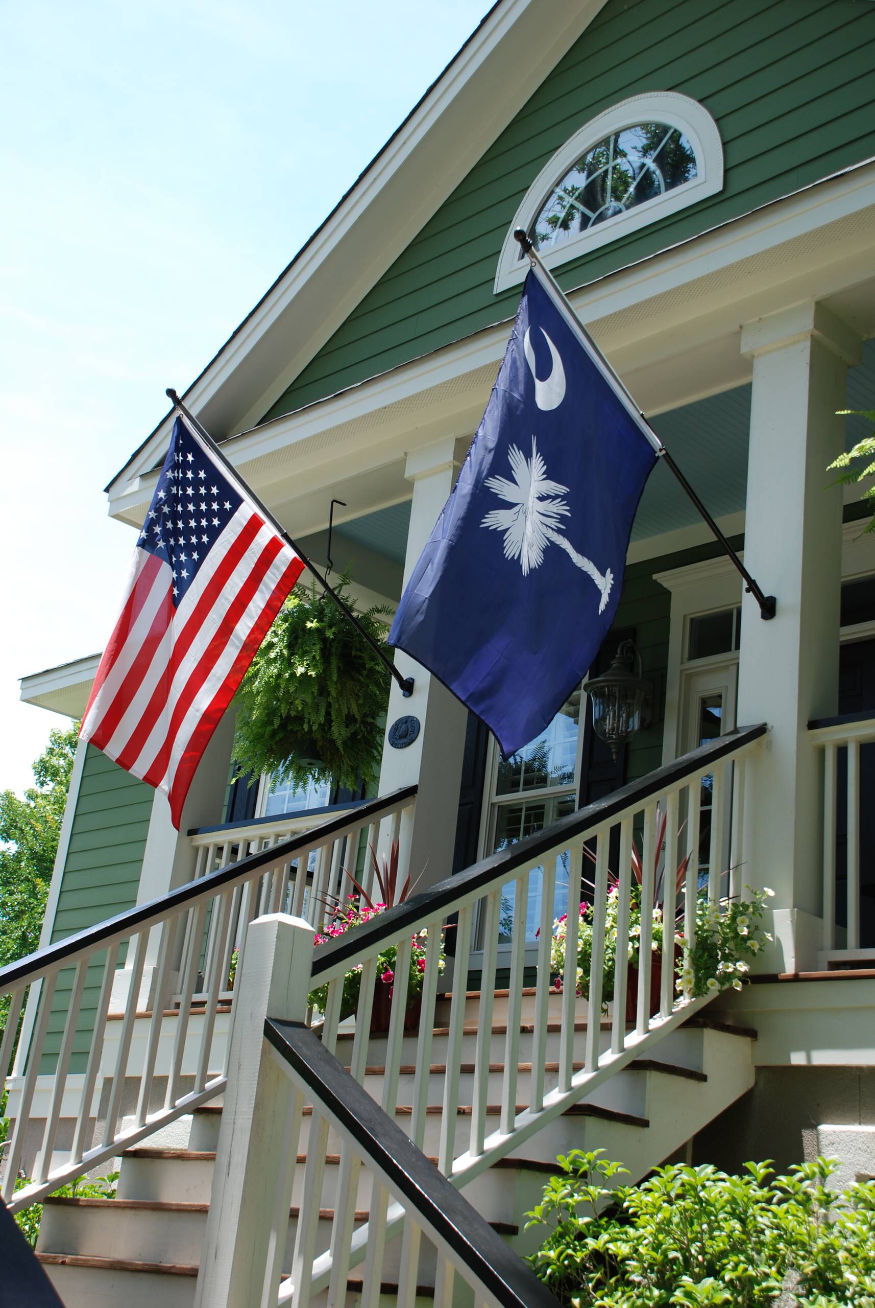 With the intricate trim on this porch, the message seems to be “more is more.” As I’m a flag maximalist, my preference would be to pump up the size of the flags on the pillars and line the entire balcony with fans.