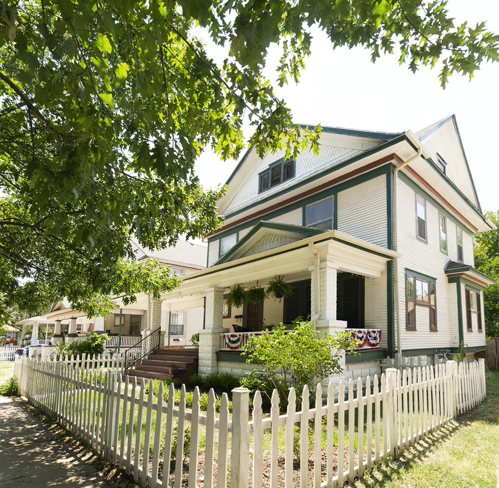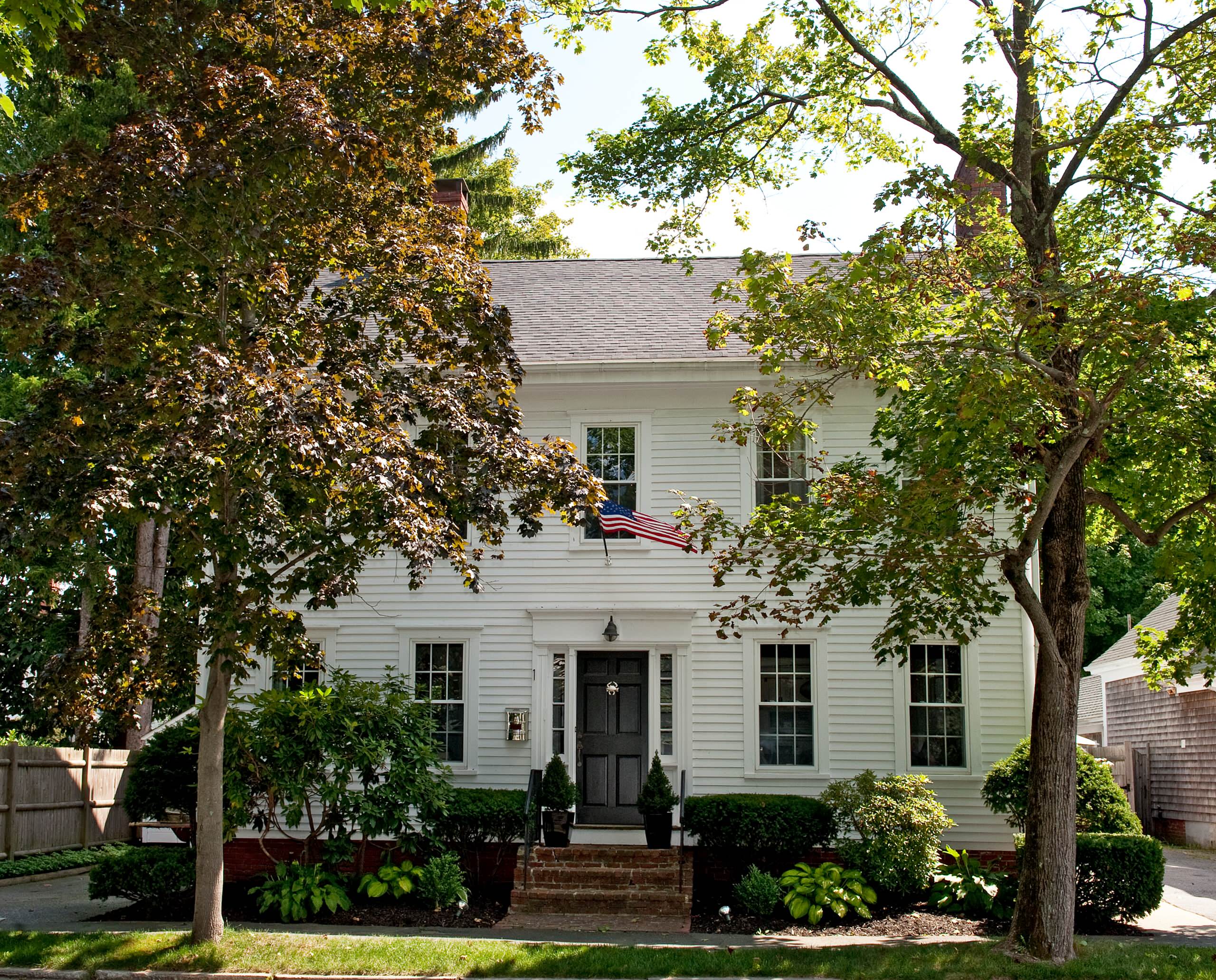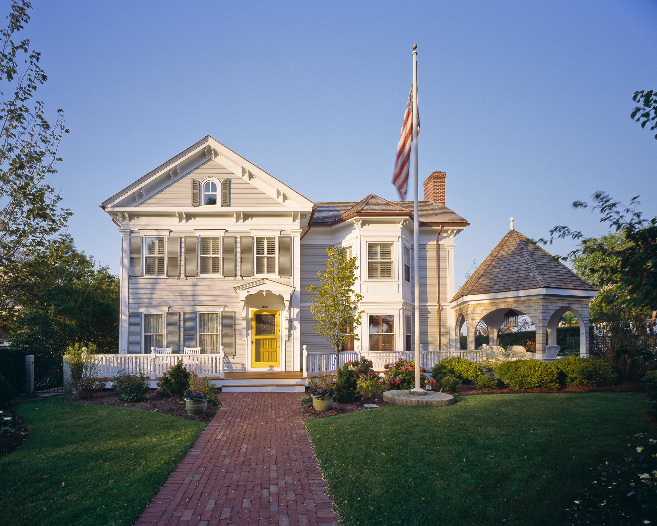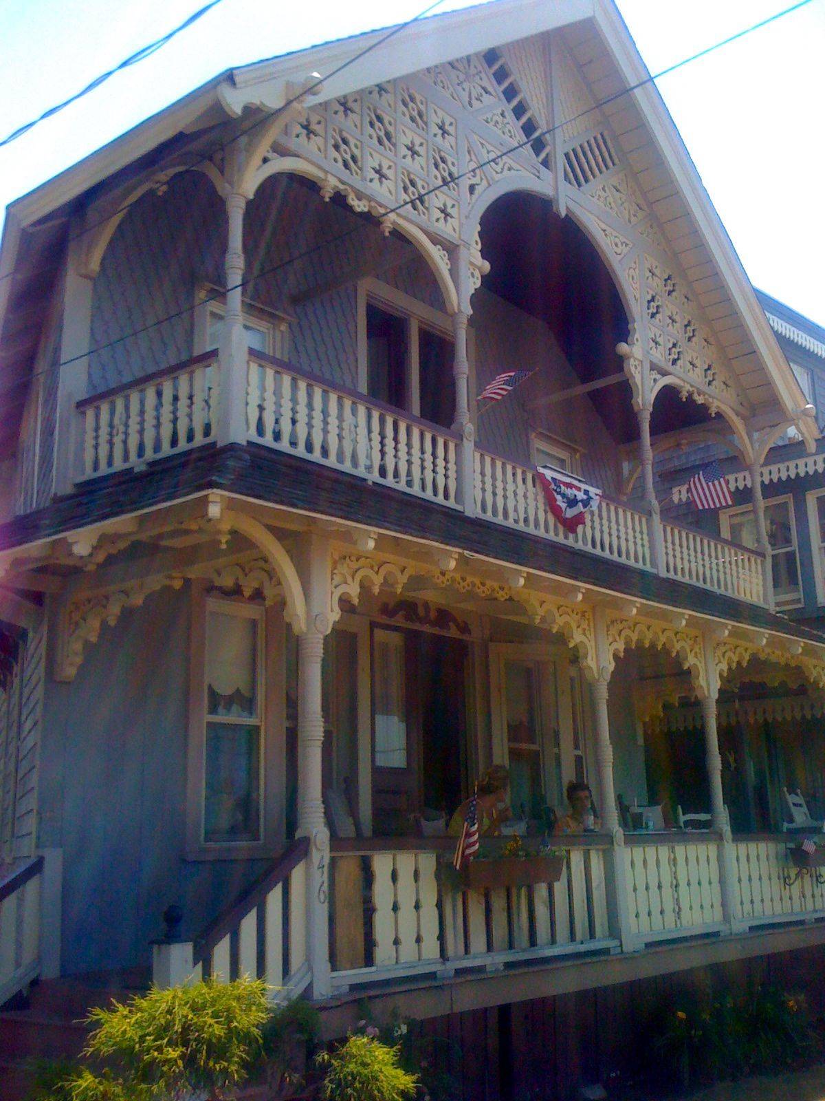 With the intricate trim on this porch, the message seems to be “more is more.” As I’m a flag maximalist, my preference would be to pump up the size of the flags on the pillars and line the entire balcony with fans.