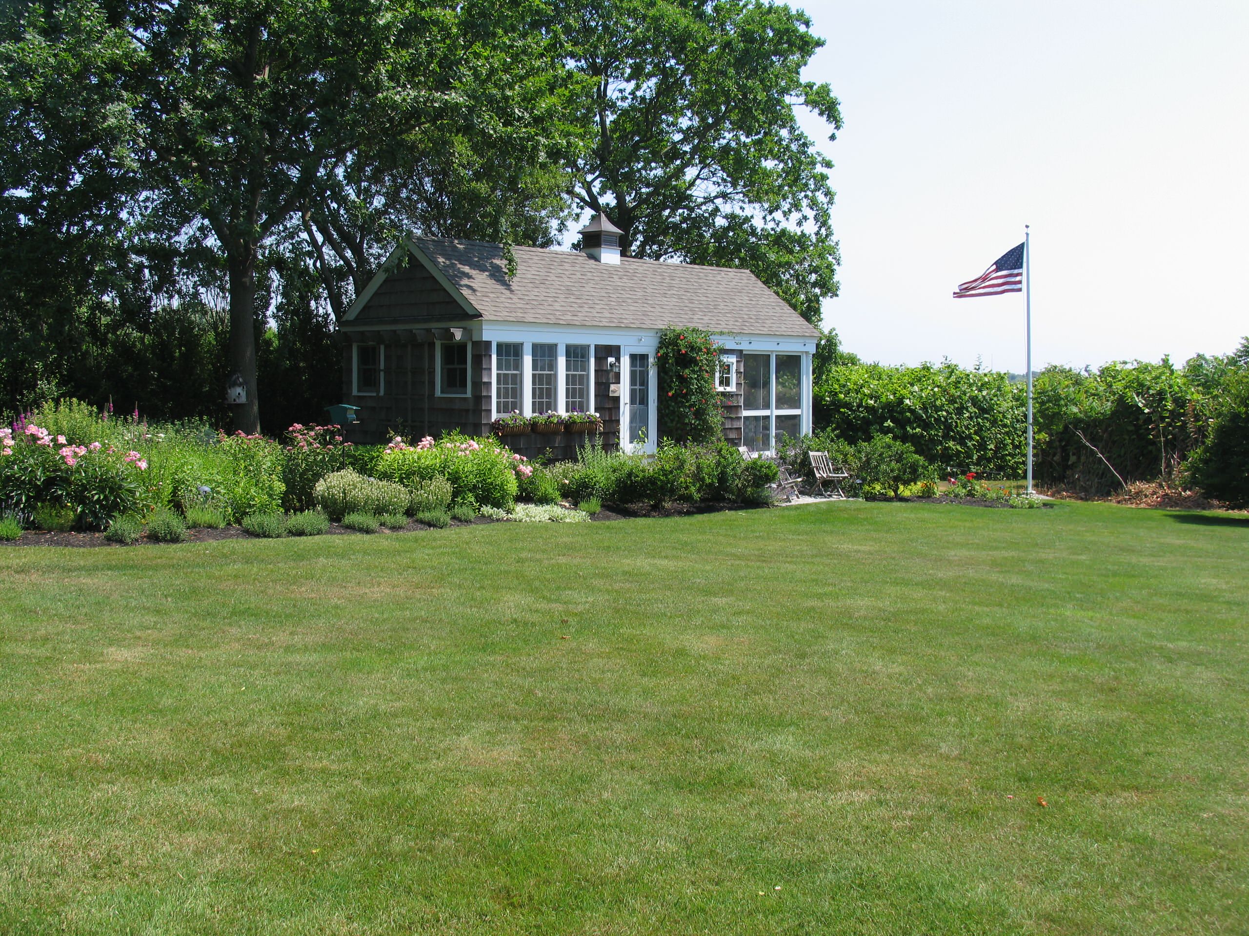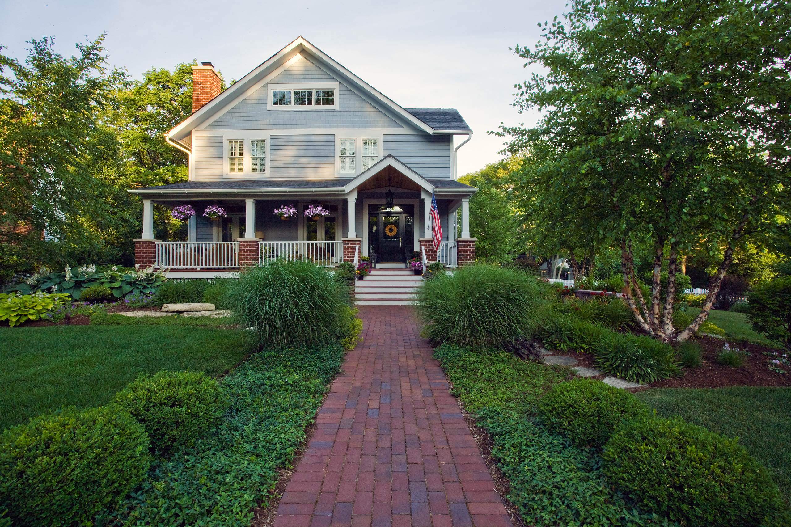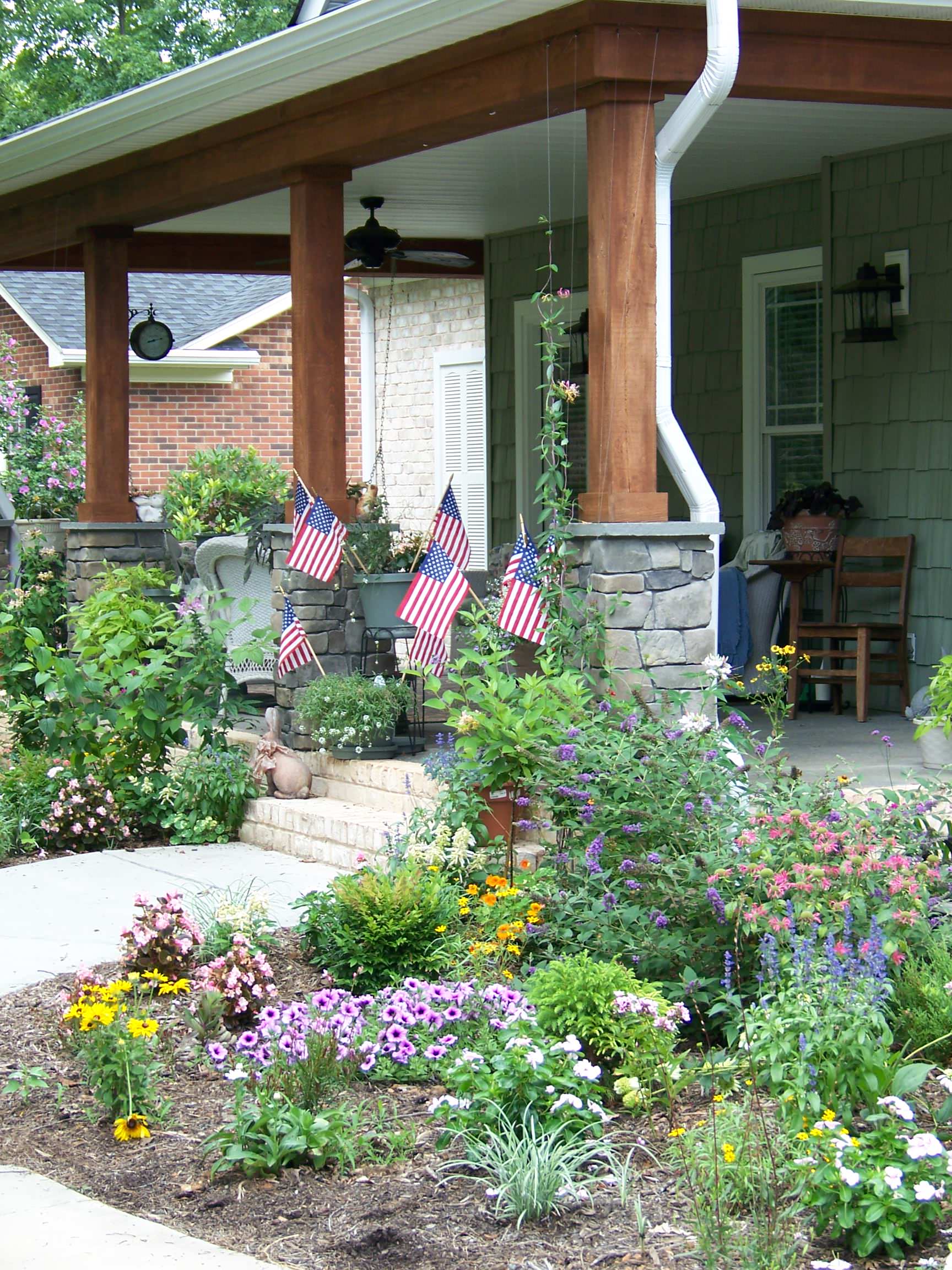 Don’t worry if red flowers aren’t your style. You don’t have to match your hanging baskets or planters with the flag; it goes with everything.