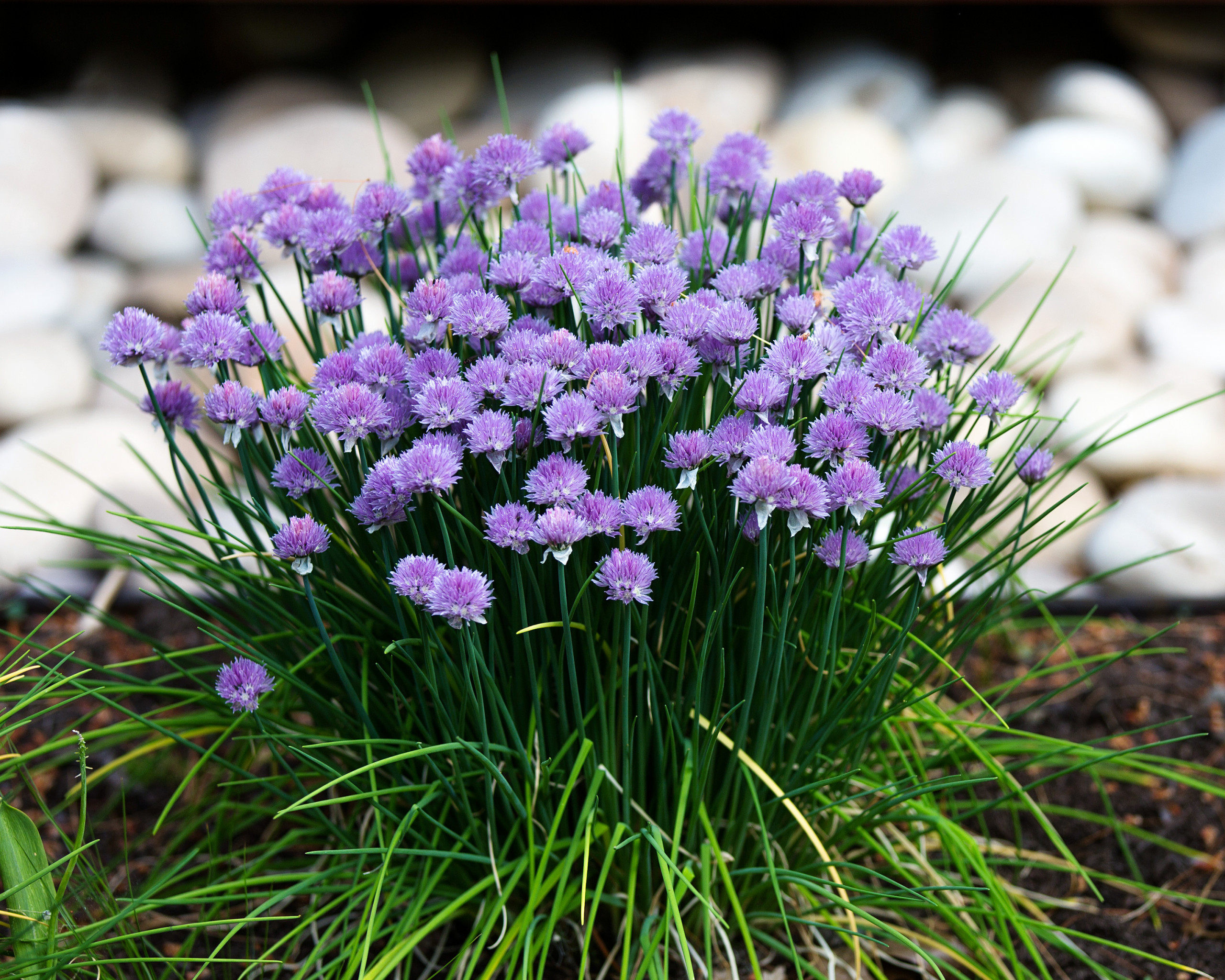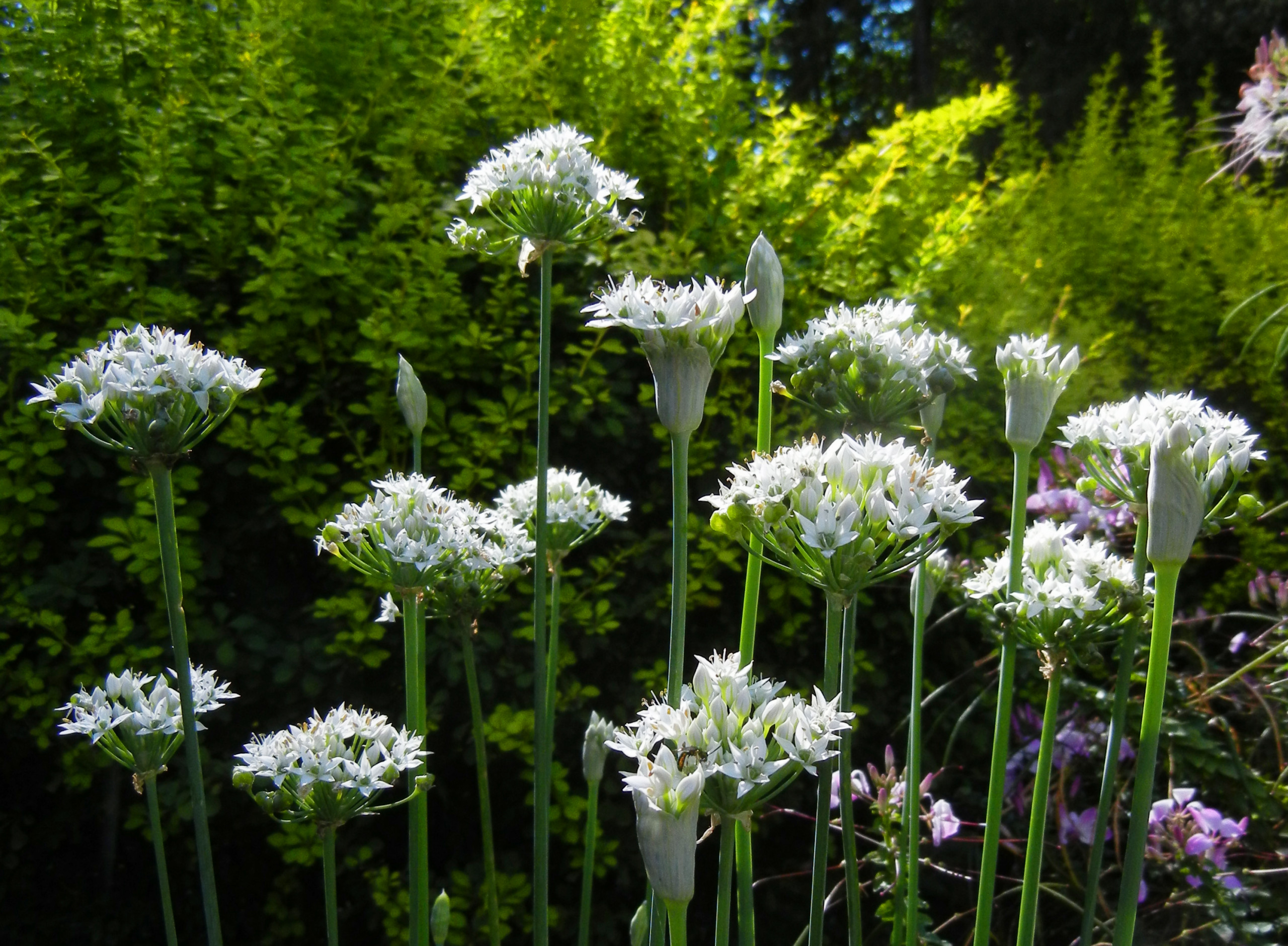 Garlic chives (A. tuberosum), as the name implies, have a more pronounced and garlicky flavor than garden chives. They’re also slightly taller, reaching 2 feet, with flatter stems, and they produce white or mauve blossoms in summer.