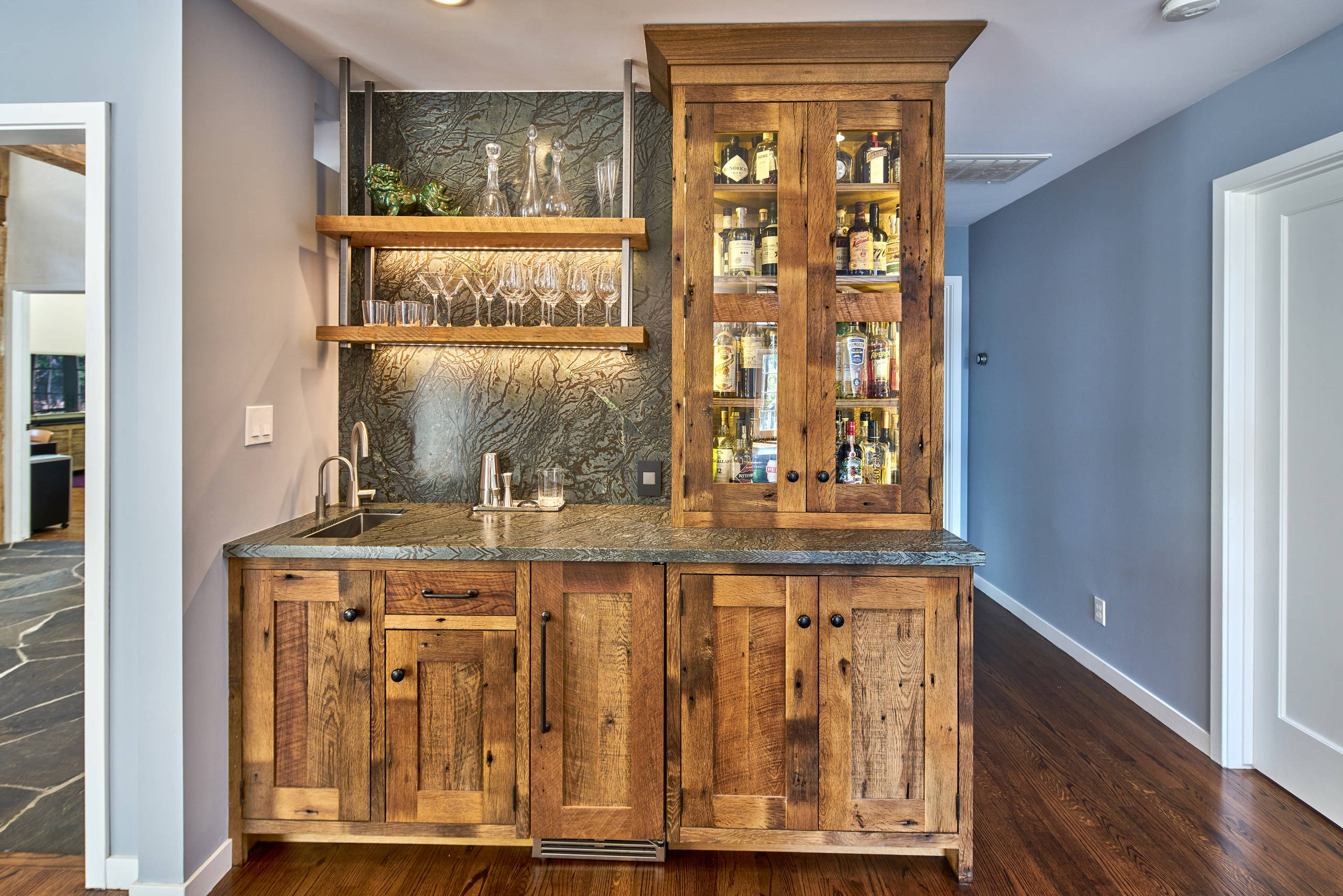 8. Like the powder room, the home bar feels like an opportunity to be bolder with colors and materials, as this one in California shows. With reclaimed wood cabinets and green iron granite counters in a leather finish, the built-in unit wows but doesn’t overwhelm the space.