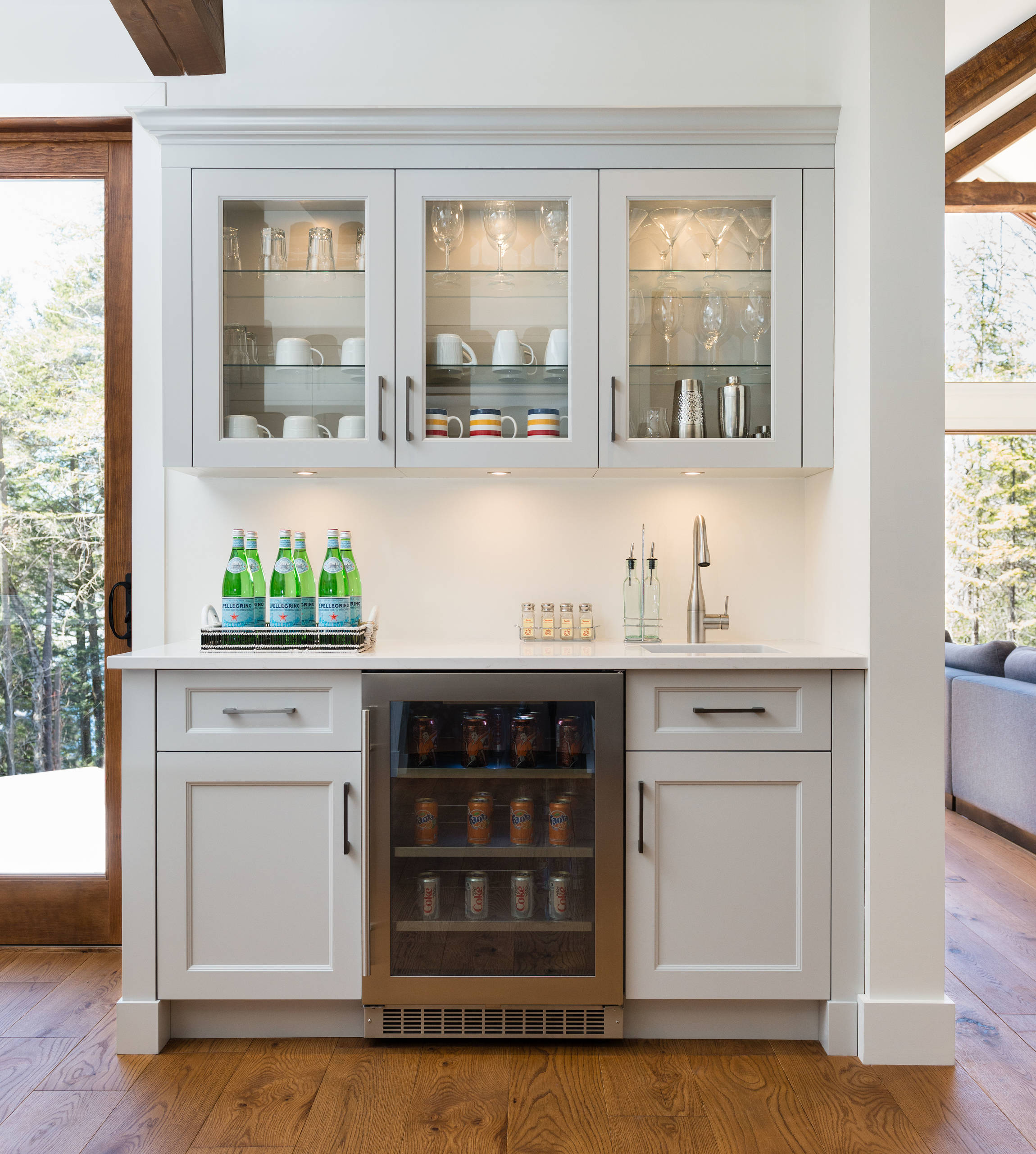 1. In this contemporary Toronto home, the most popular home bar of the year uses that tricky area under the stairs. It provides extra storage and finds use as a coffee bar. Bright lighting makes the all-white vignette stand out against warm gray wood floors.