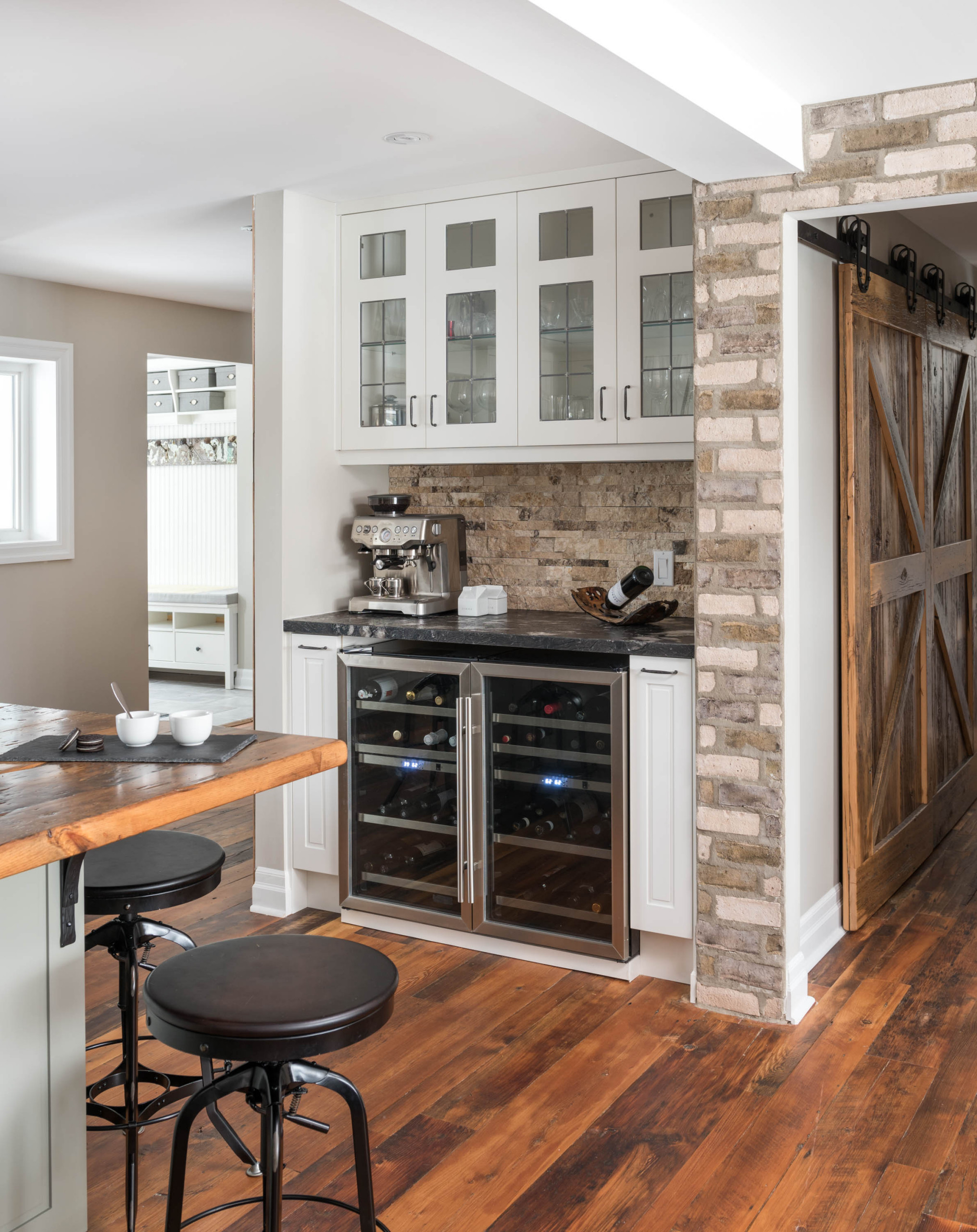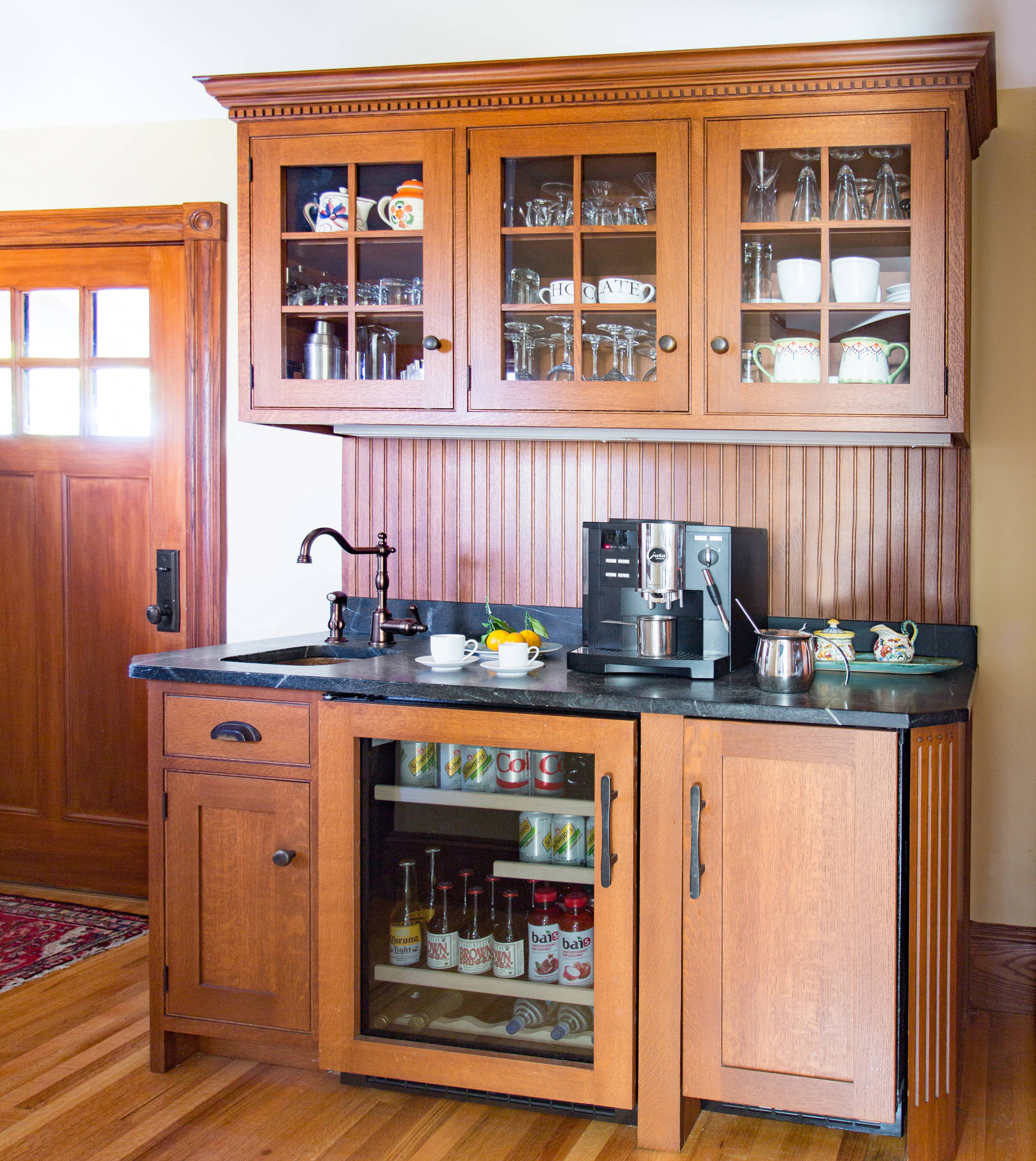 9. This bar area between the kitchen and the dining room of an 1890s home in Massachusetts was part of a renovation that transformed the 1980s kitchen into a space that felt more in line with the home’s age. Modern amenities, like a beverage cooler and an ice machine, are housed in traditional oak cabinets. The beadboard backsplash and soapstone counters help preserve the traditional style.