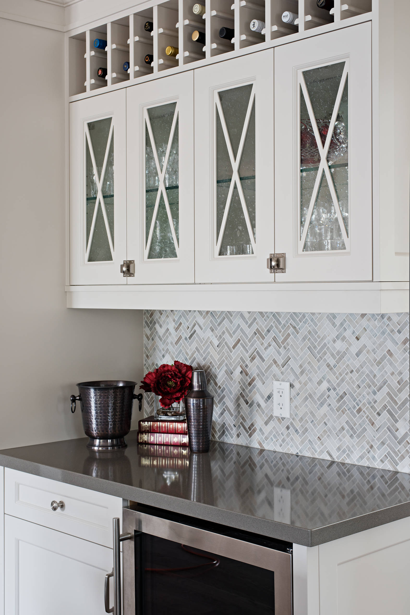 5. No detail is overlooked in this Toronto home bar, with an eye-catching marble herringbone backsplash echoing the “X”-front upper cabinet doors. Where there could have been wasted space above, a built-in wine rack not only adds storage but also brings the bar up to the crown molding.