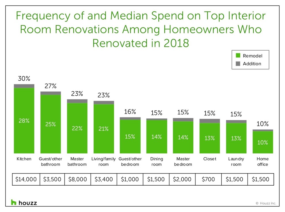 In 2018, kitchens were the most popular rooms to renovate, whether as part of a remodel of an existing space or as an addition to a home. Guest and other types of bathrooms were second, followed by master bathrooms.