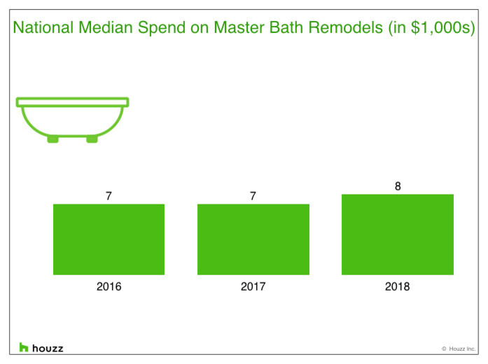 The median spending amount for master bathrooms was $8,000 in 2018, a 14 percent increase from the year before. For nonmaster bathrooms, the median cost was $3,500, an increase of 17 percent over the year before.