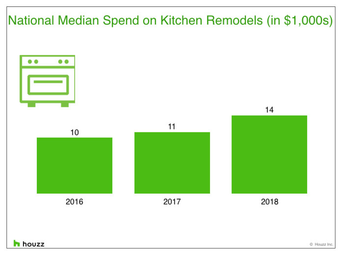 The spending for a homeowner who spent the median amount rose 27 percent, from $11,000 in 2017 to $14,000 in 2018. As mentioned, the large jump in a single year is likely driven in part by increased tariffs on imported products and materials, like engineered quartz and natural stone, both popular kitchen countertop materials.