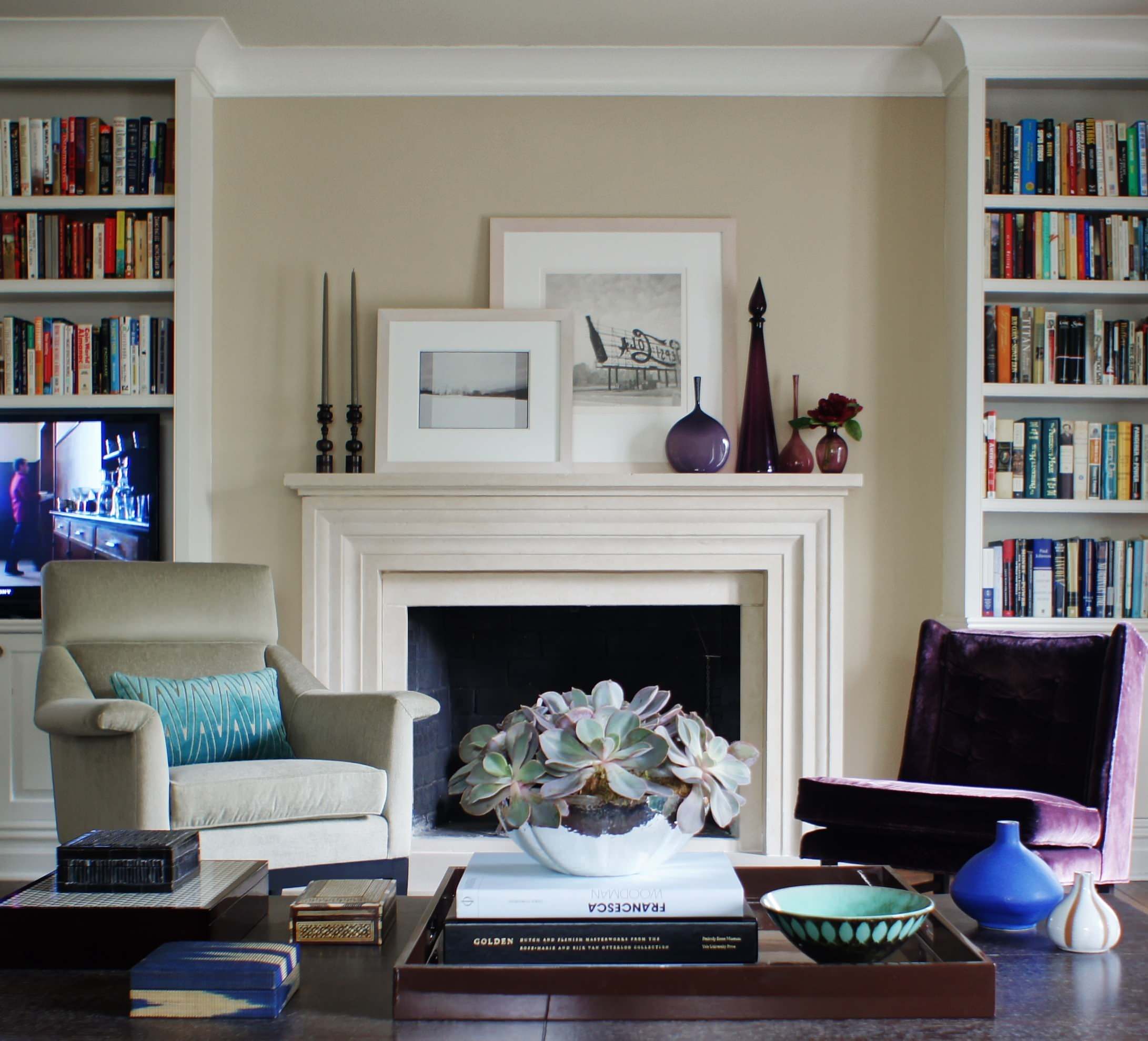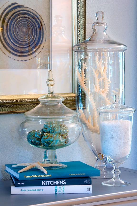 Keep your eyes entertained. Here's another instance where the accessories pick up the dominant accent color in the room and give your eye someplace to travel. The glass compotes on the coffee table make even ordinary objects look special.