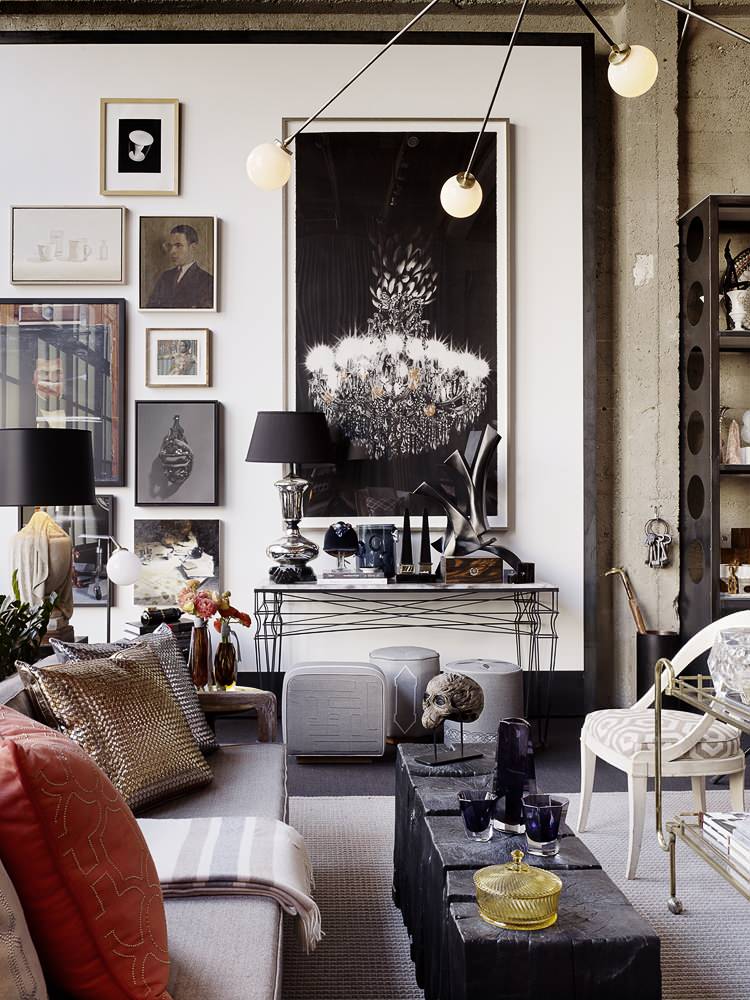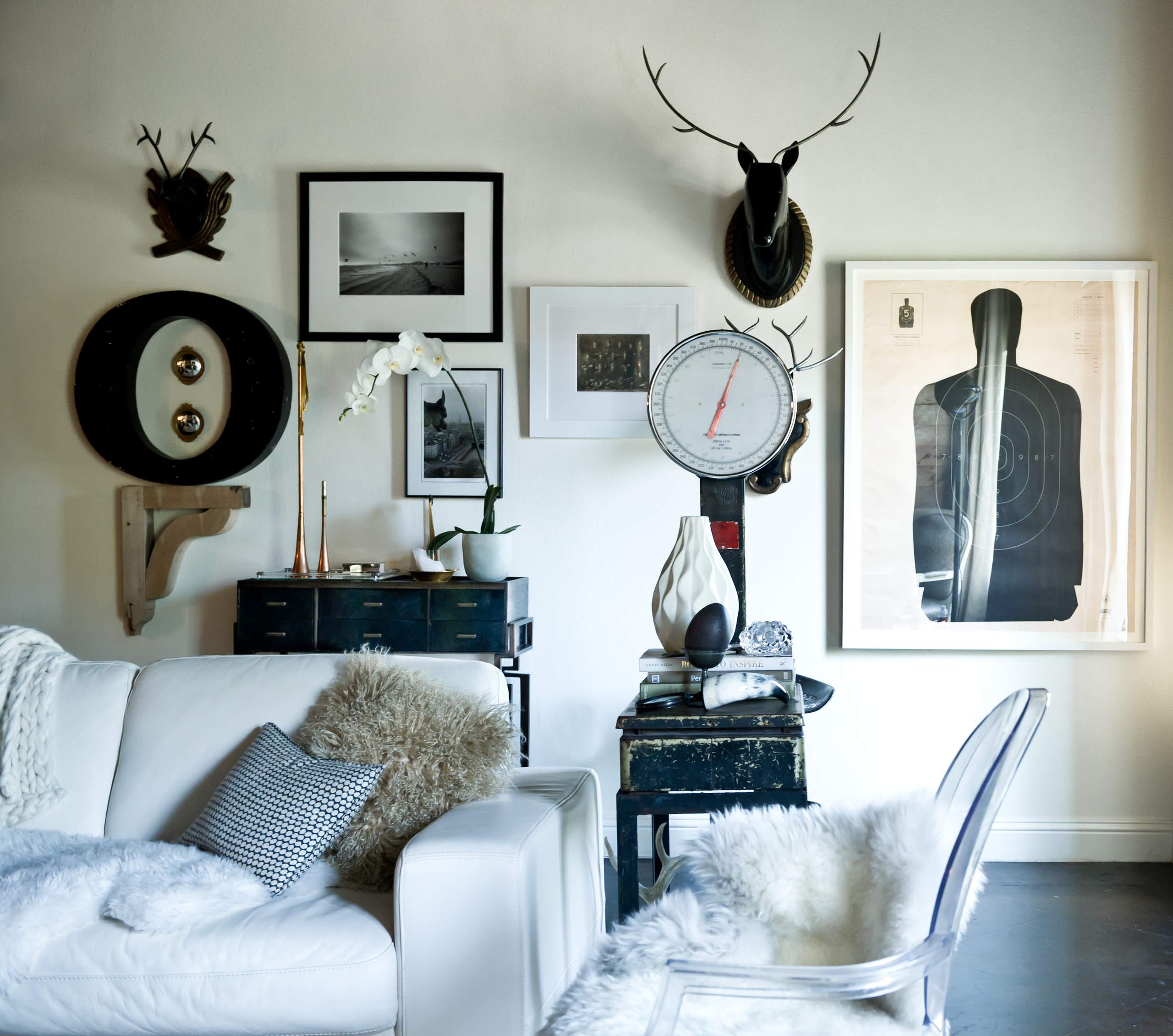 Look for balance. Interior designer Jay Jeffers knows his way around an accessory! I like the way he used the sculpture to balance the lamp on the console table here, and the art grouping to balance the tall photograph and help bridge the distance between the furniture and the ceiling in what is obviously a tall space.