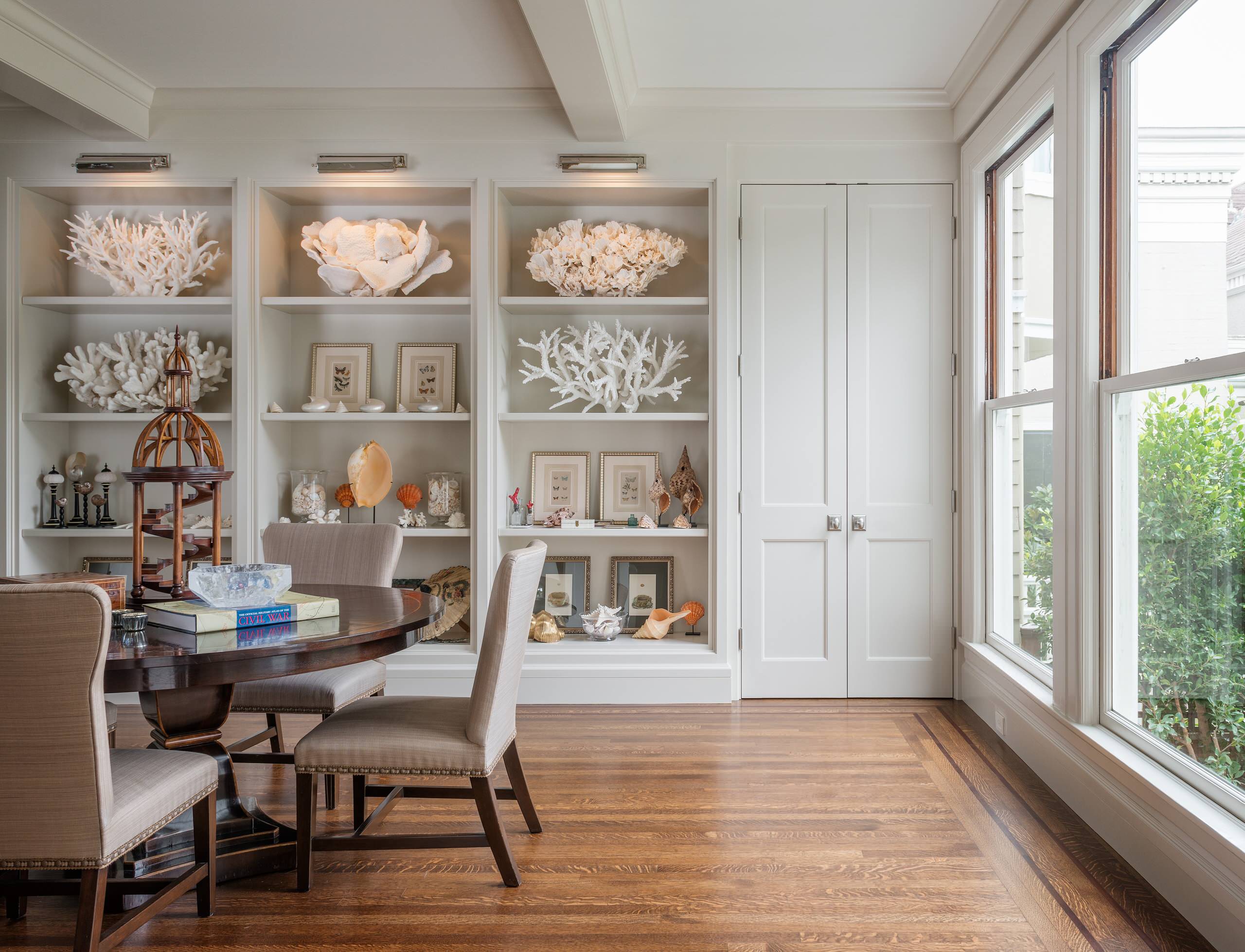 Since all three items on this coffee table are approximately the same size, the coral was set atop a stack of books to stagger the heights. Notice how the book jackets pick up the color of the vase and the seat cushion.
