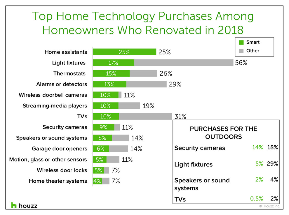 Still, 1 in 7 homeowners who renovated in 2018 bought a smart home product that can be controlled and monitored from a mobile device or a computer, such as a smart light fixture, smart thermostat, smart alarm or smart detector.