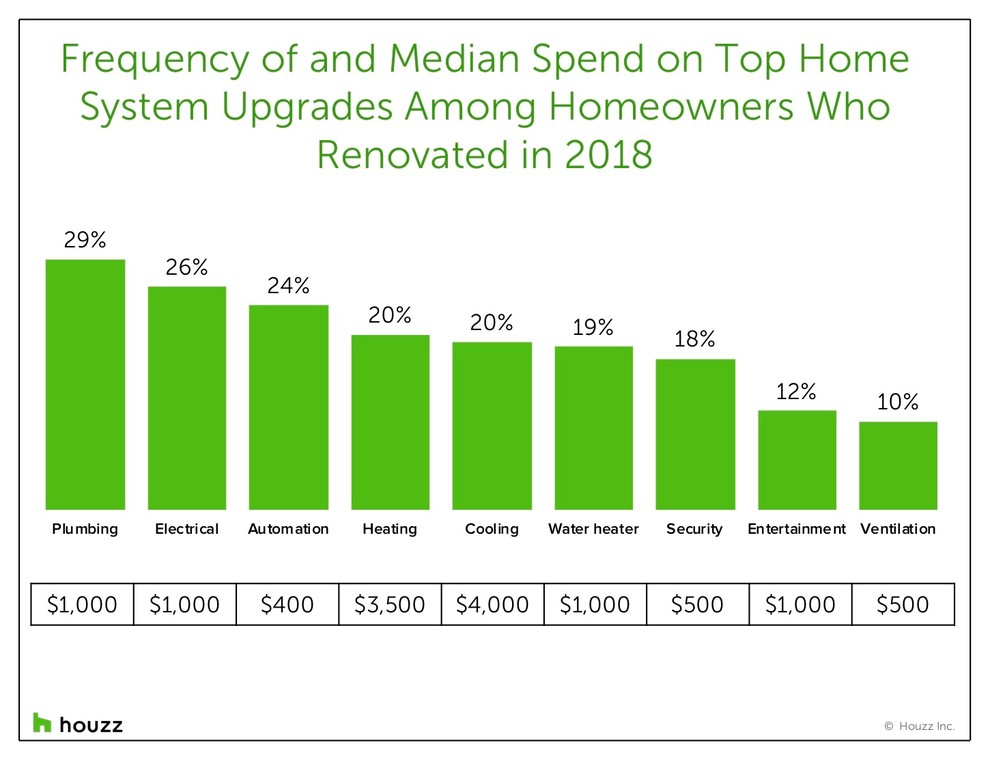 But despite the steady rise in popularity of home security systems, the most popular systems to upgrade as part of a home renovation in 2018 were plumbing and electrical systems, as the chart here shows. Meanwhile, the most expensive systems to upgrade as part of a home renovation last year were cooling systems, with a median spend amount of $4,000, and heating systems, with a median spend of $3,500.