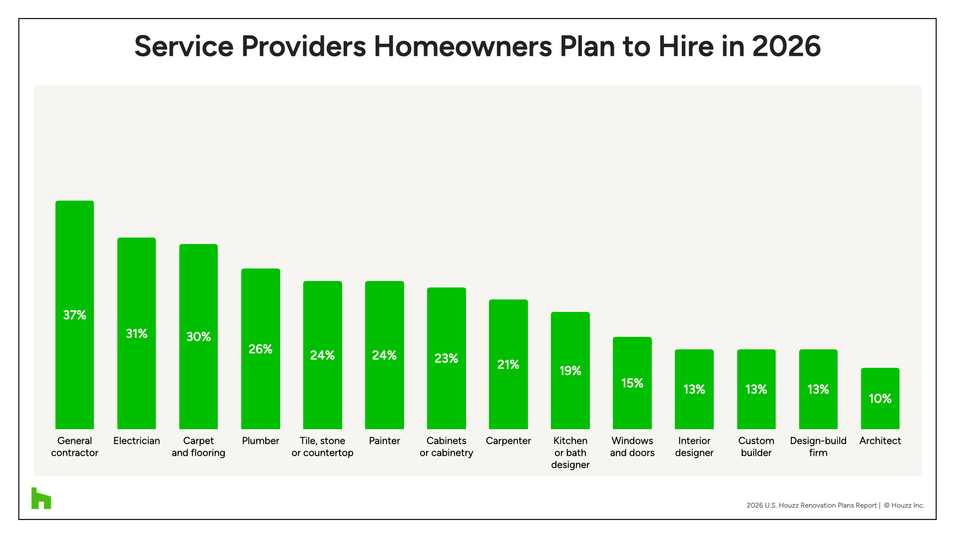 Homeowners plan to hire a wide range of design and construction professionals for their renovations. General contractors are in the top spot at 37%. Homeowners also plan to hire kitchen or bath designers (19%); interior designers, custom builders and design-build firms (13% each); and architects (10%).