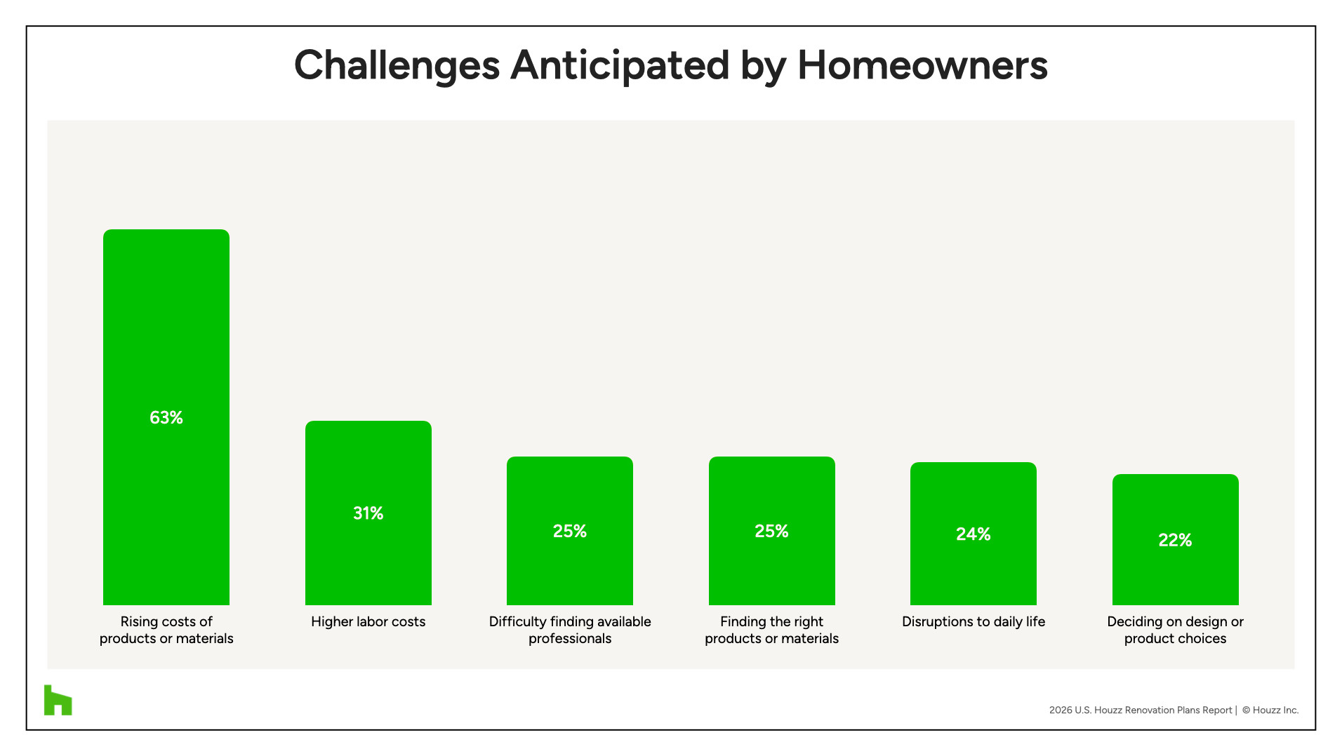 Renovation projects are moving forward with homeowner awareness of the potential challenges. The most frequently cited challenge is the rising cost of products or services (63%). Homeowners also named as challenges higher labor costs (31%), difficulty in finding available pros (25%), finding the right products or materials (25), disruptions to daily life (24%) and having to make design or product decisions (22%).