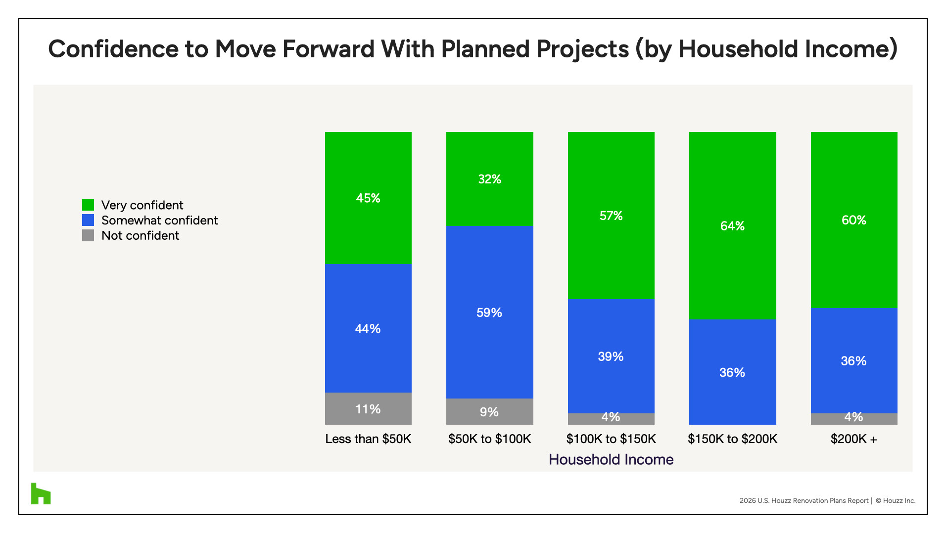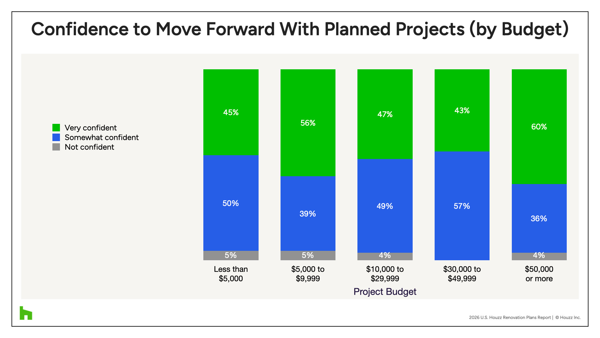 While overall confidence is strong across all project budgets, 60% of homeowners with a project budget of $50,000 or more say they are very confident of moving forward in 2026. By comparison, 47% of homeowners with a $10,000 to $29,999 budget and 43% of those with a budget of $30,000 to $49,999 are very confident.