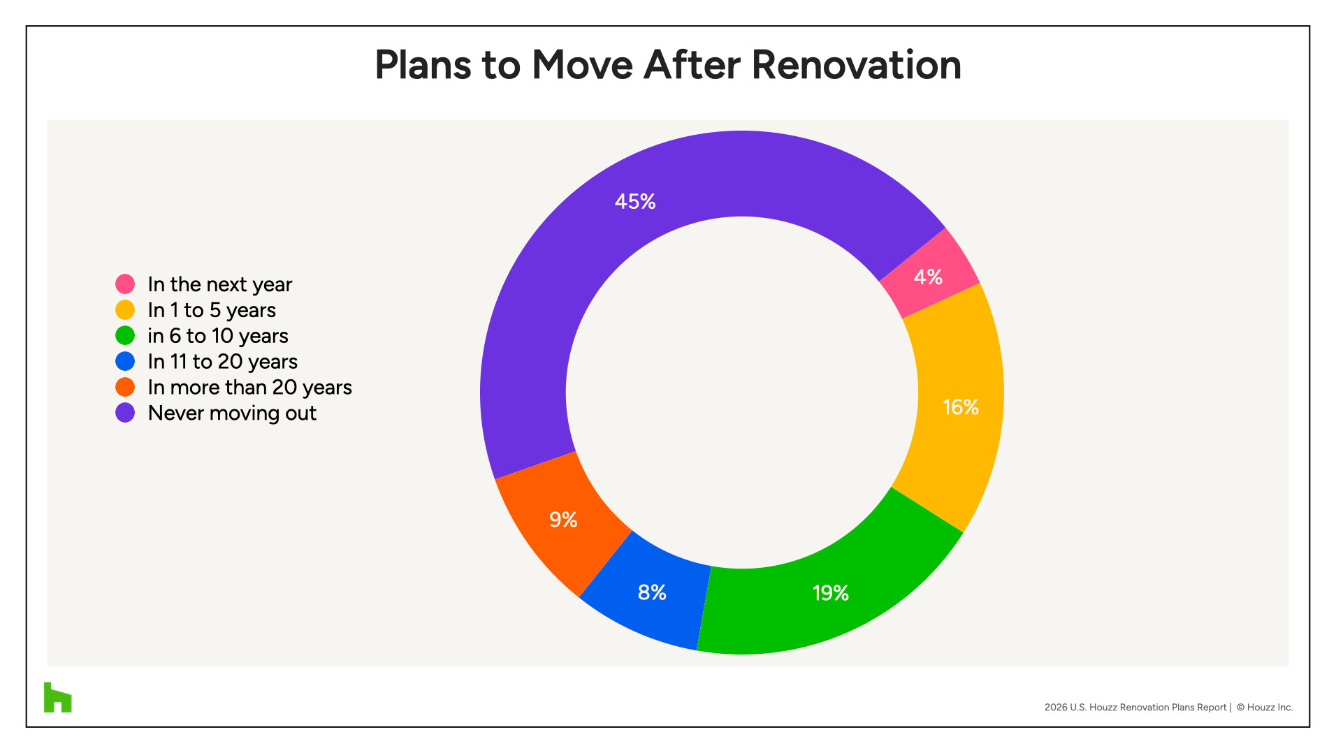 Nearly half of homeowners (45%) planning to renovate this year expect never to move out of their home. Nine percent plan to stay in their home at least 20 years. One in five (20%) plans to move in the next five years.