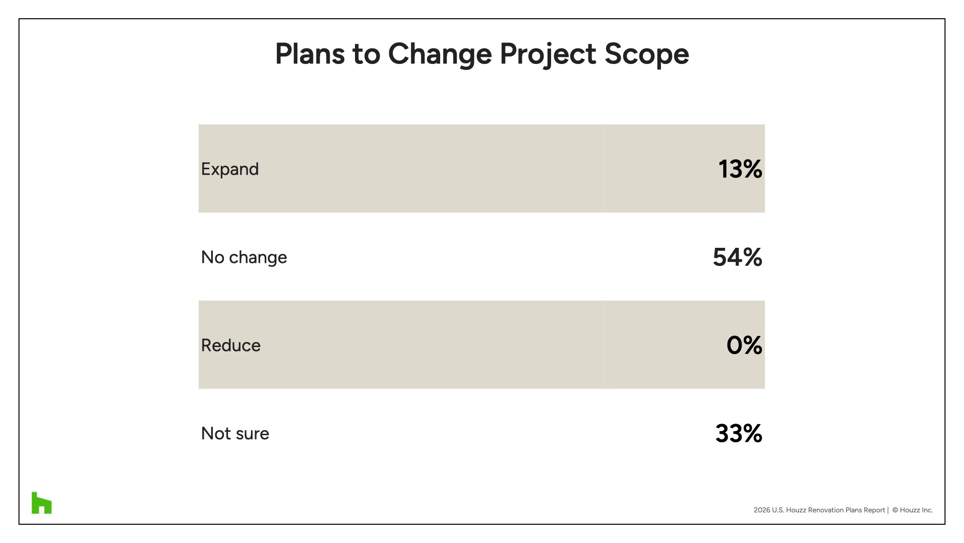 The majority of homeowners (67%) are set on the scope of their project. More than half (54%) plan to keep it as is. Thirteen percent plan to expand the scope of the project. A third are not sure, and none expect to scale back.