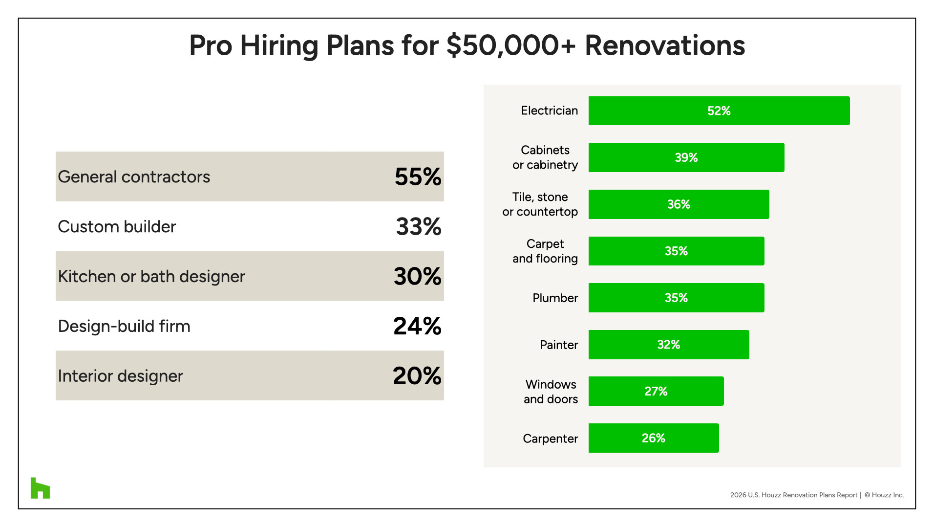 For renovations of $50,000 and more, pro hiring increases. Fifty-five percent of homeowners in this budget category plan to hire general contractors. Also in the mix for $50,000-plus projects are custom builders (33%), kitchen or bath designers (30%), design-build firms (24% ) and interior designers (20%).