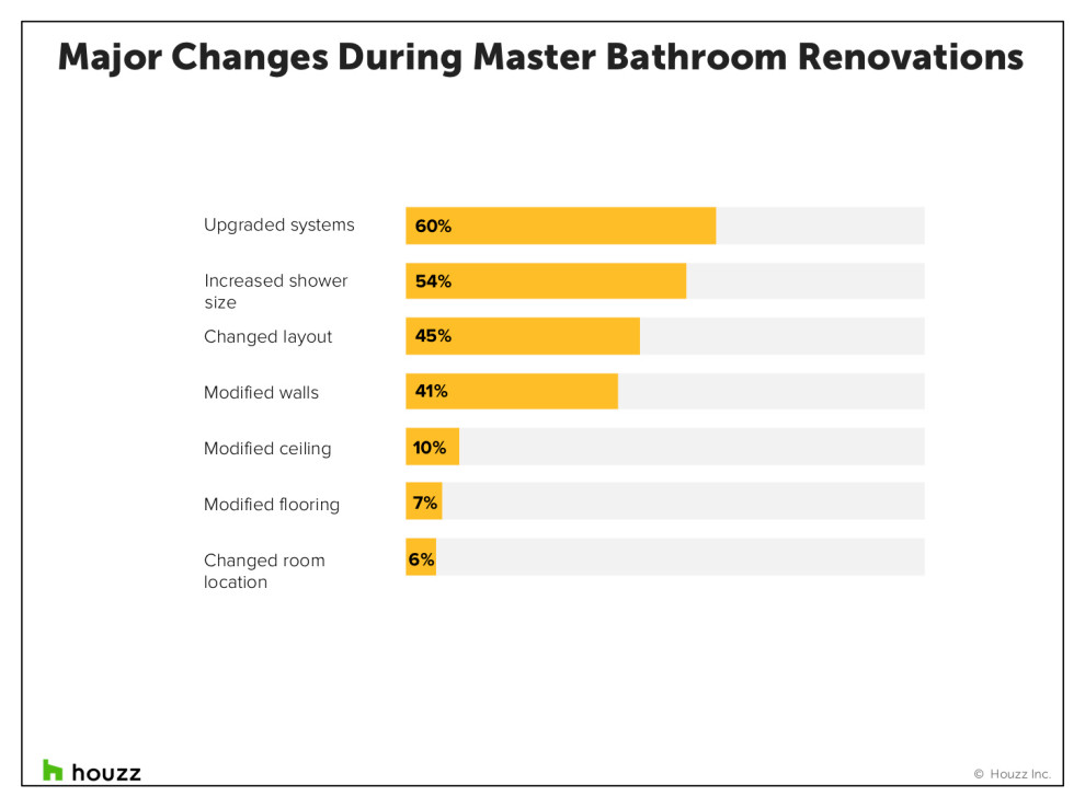 Showers are getting special attention in master bathroom remodels. Renovating homeowners are nearly two and a half times as likely (54%) to increase their shower’s size as they are to increase the size of the bathroom itself (20%). They are also more likely to change the bathroom’s layout (45%).