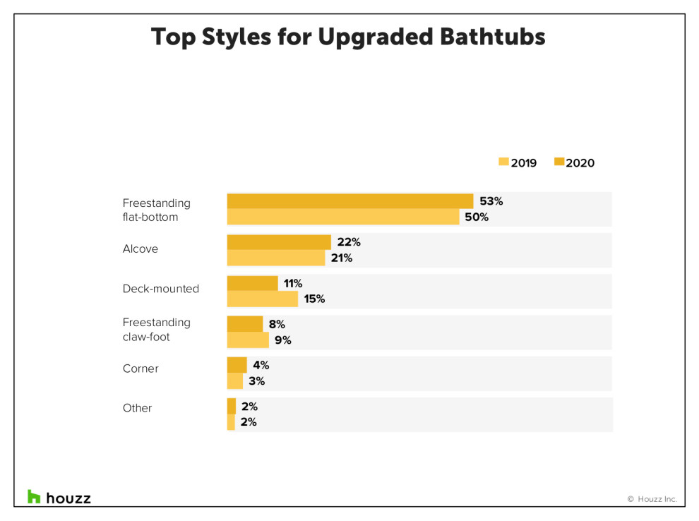 As showers gain steam, homeowners renovating their master bathroom are focusing less on the bathtub. Only 32% upgrade the tub during their project, down from 34% in 2019. And for the first time since Houzz began tracking the data in 2014, half of renovated master bathrooms don’t have a tub at all.