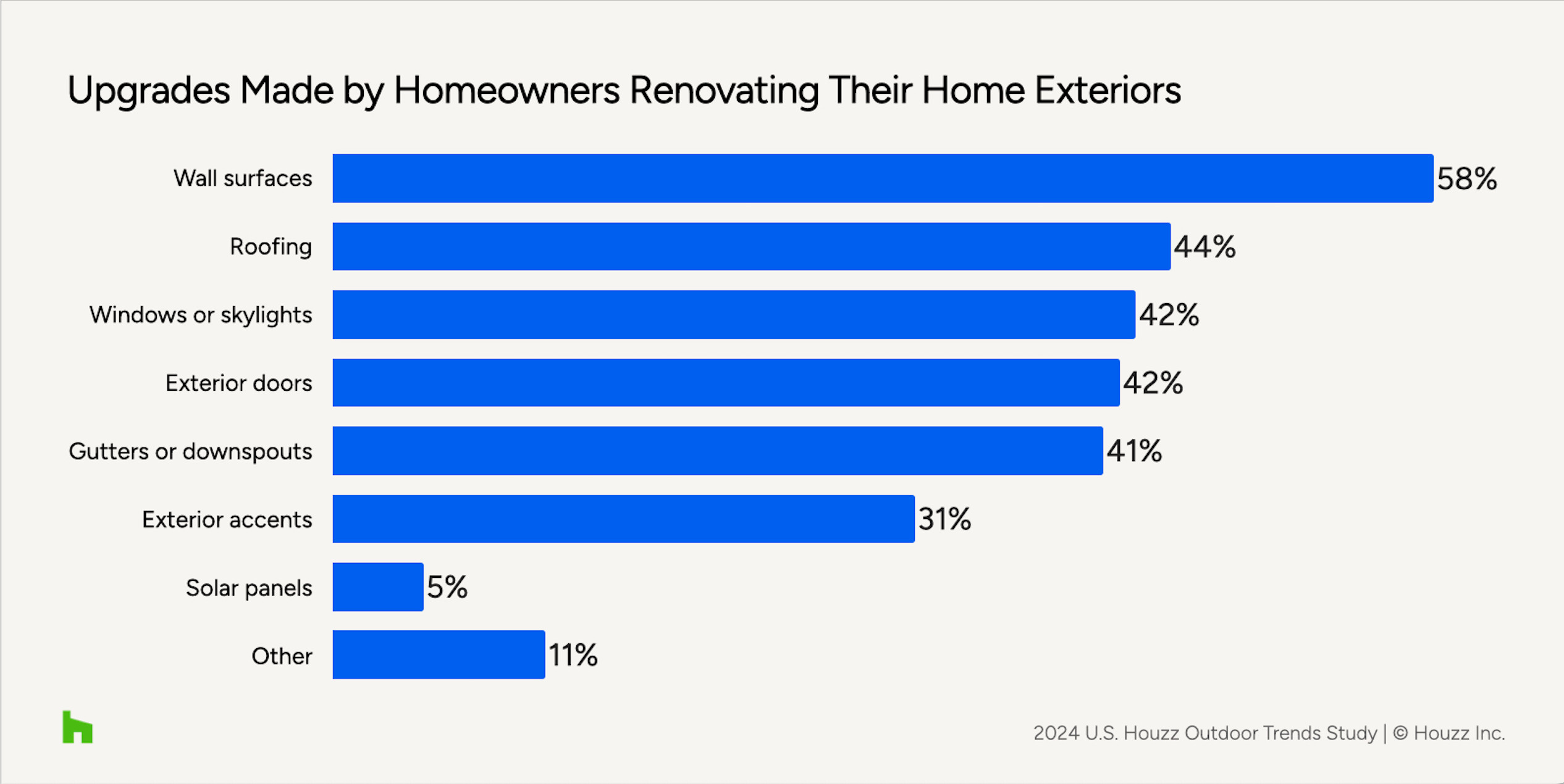 For homeowners pursuing more significant exterior upgrades, nearly 3 in 5 homeowners upgraded their home’s wall surface (58%). Roofing (44%), windows and skylights (42%) and exterior doors (42%) were common projects, as well.