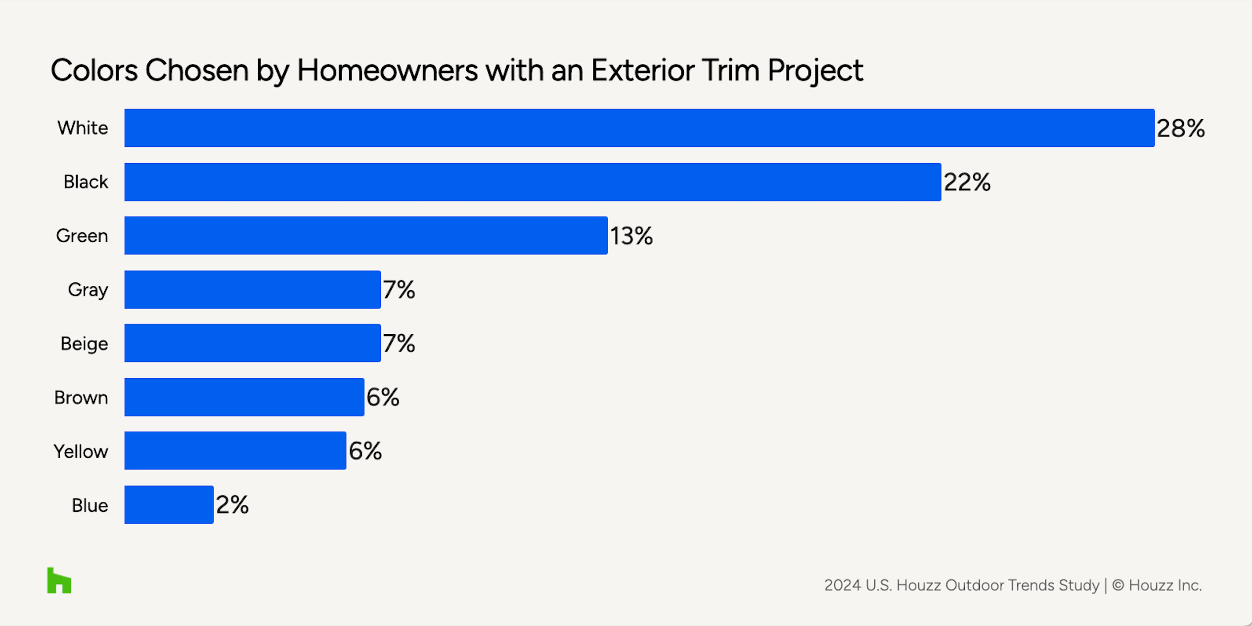 White was the leading trim color chosen among homeowners (28%), followed by black (22%) and green (13%). The majority of renovating homeowners chose contrasting wall and trim colors (71%).